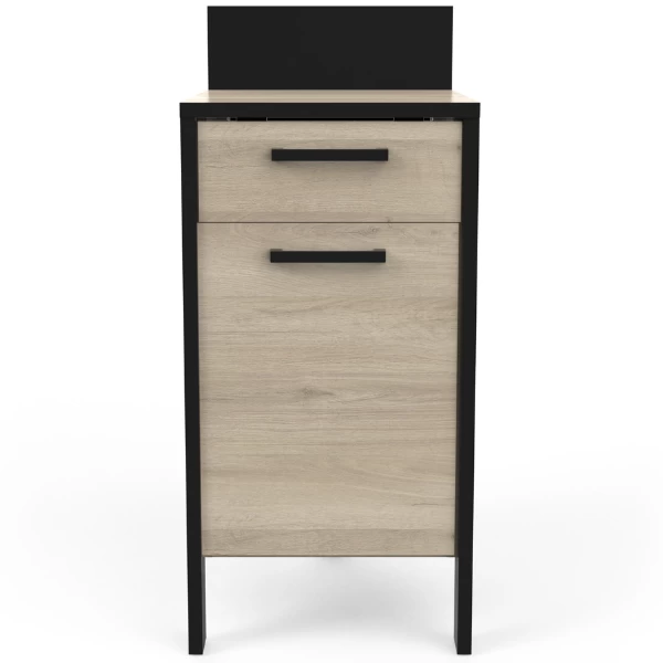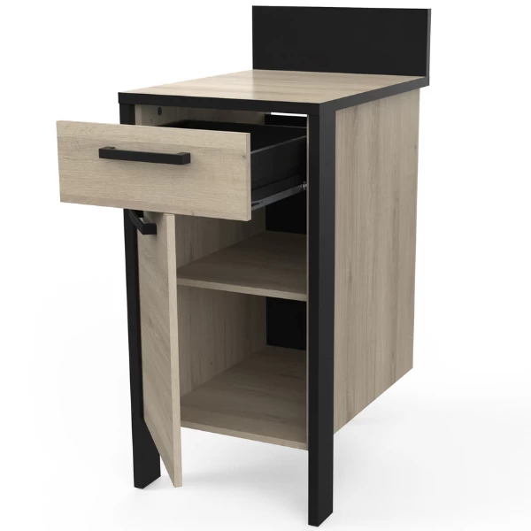 Onderkast Chivaya is gemaakt uit gemelamineerde spaanplaat in Kronberg eikdecor en matzwart en heeft een verstelbare plastieken poot achteraan in het midden. De kast bestaat uit 1 lade, 1 draaideur en 1 legplank.