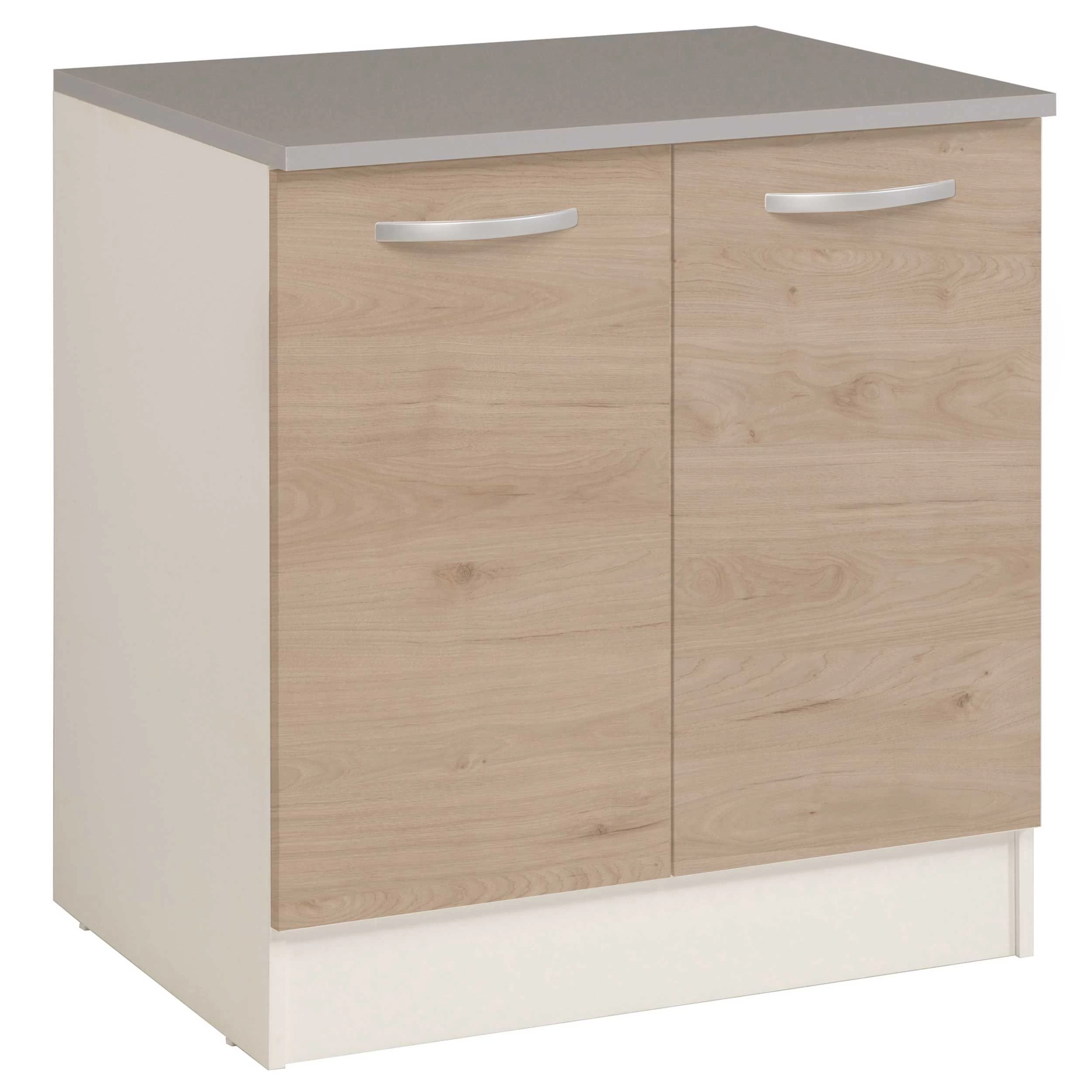 Deze kast in een decor van lichte Jackson eik beschikt over 2 deuren en een ruim opbergvak. In het werkblad kan je eveneens een spoelbak integreren. De handgrepen zijn gemaakt van kunststof en kregen een moderne metaalkleur. Kies op onze site de overige bijbehorende meubelen uit en stel zelf jouw droomkeuken samen!