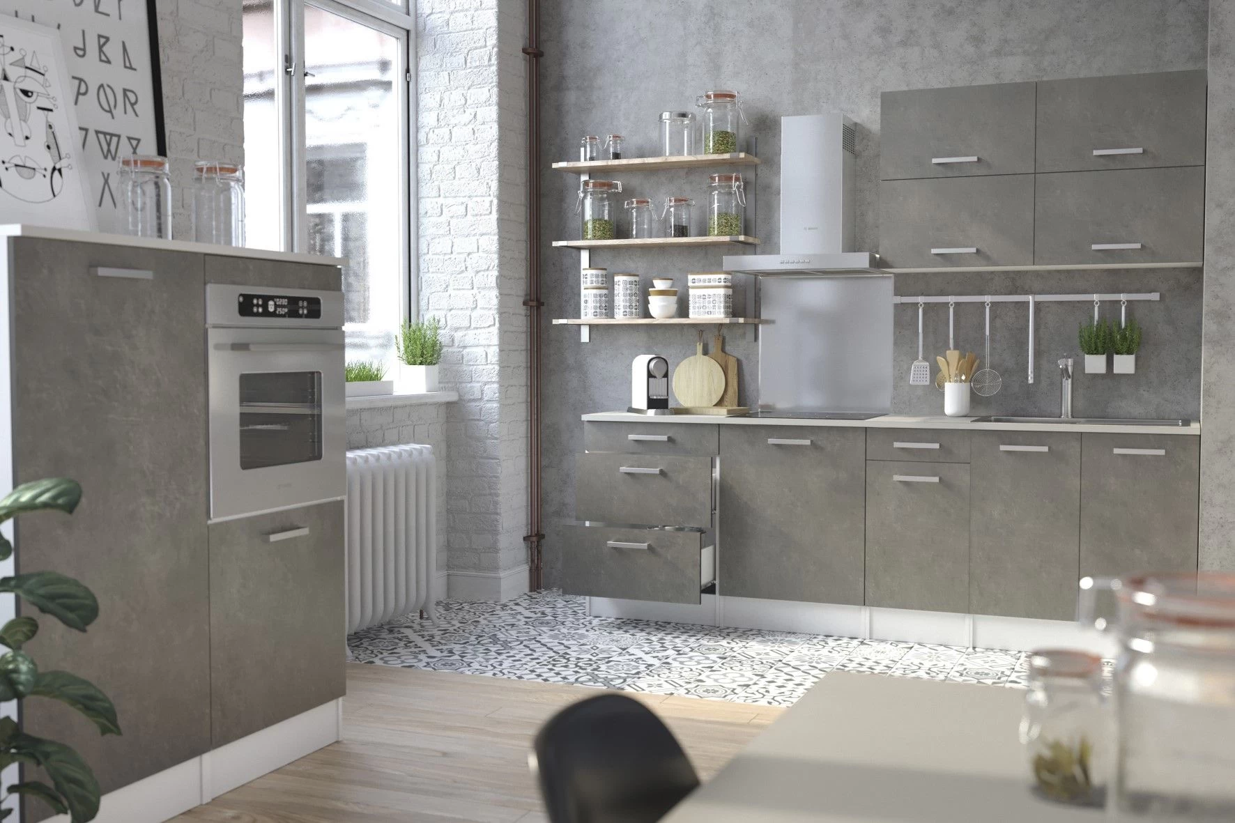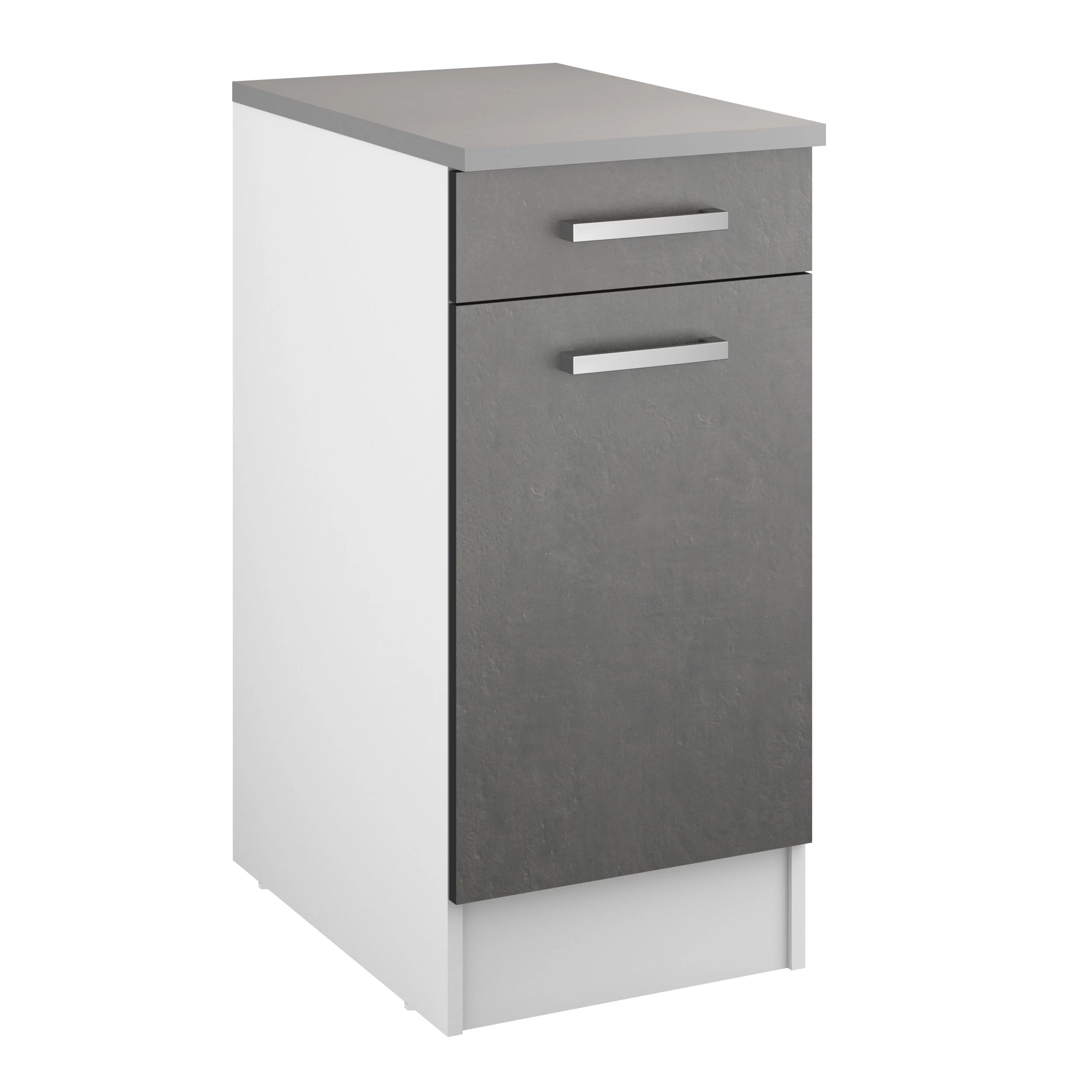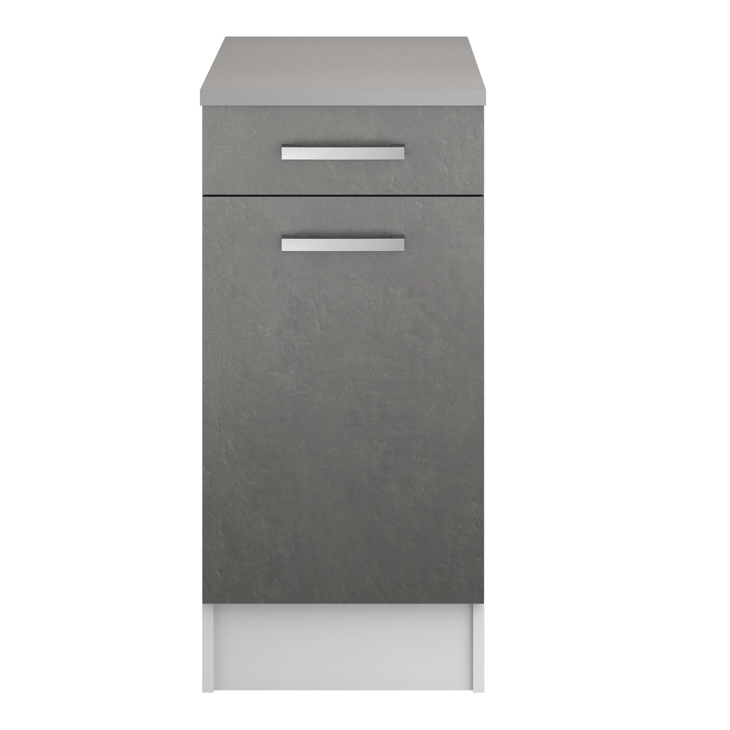 Met de kasten van keuken Eli kies je volledig zelf hoe jouw nieuwe keuken er komt uit te zien. Deze onderkast is gemaakt van spaanplaat en is afgewerkt in betonlook. Het bestaat uit een lade en een deur met legplank. Je kan tijdens de montage zelf kiezen of je het deurtje naar links of rechts laat openen.