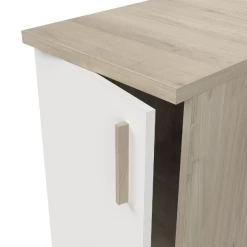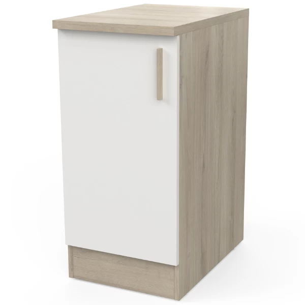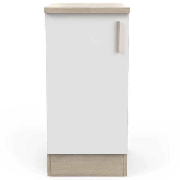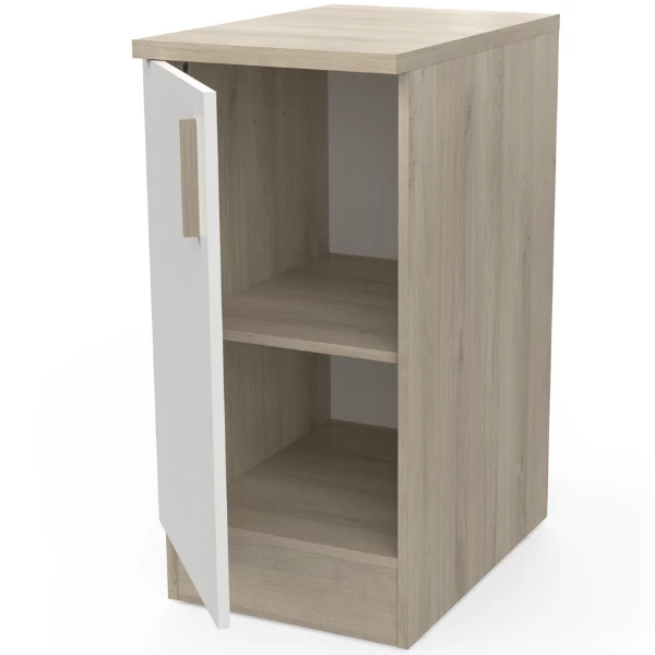 Onderkast Romanie is gemaakt uit gemelamineerde spaanplaat in Kronberg eikdecor en mat wit. De kast bestaat uit 1 draaideur en 1 legplank.