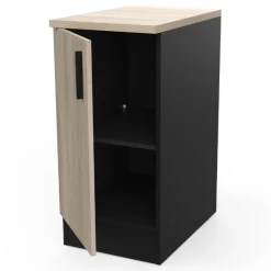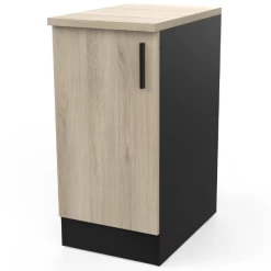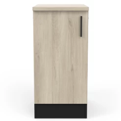 De combinatie van het strakke matzwart en het lichte kronberg eikdecor van onderkast Romanie is een echte voltreffer. Deze kast beschikt over een legplank achter de draaideur voor uw servies, allerhande keukengerei, etc. Combineer met de andere keukenkasten van de Romanie-collectie en stel zo uw eigen keuken samen naar smaak. De schroeven en pluggen voor muurbevestiging zijn niet inbegrepen.