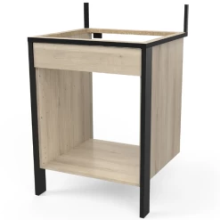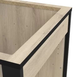 Onderkast voor inbouwfornuis Chivaya is gemaakt uit gemelamineerde spaanplaat in Kronberg eikdecor en matzwart en heeft een verstelbare plastieken poot achteraan in het midden.
