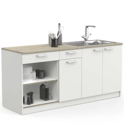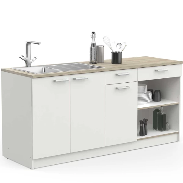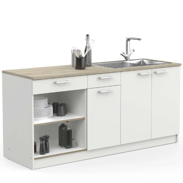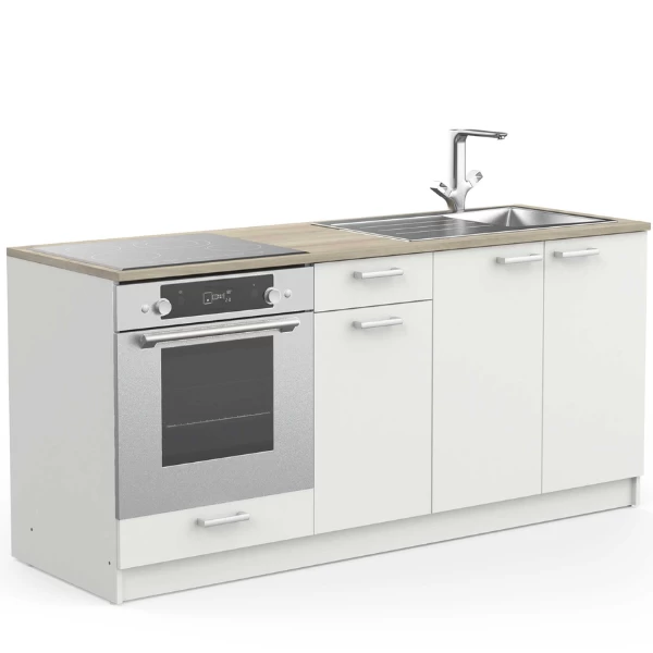 Onderkastcombinatie chef is gemaakt uit gemelamineerde spaanplaat in wit en heeft een werkblad met Kronberg eikdecor. De handgrepen zijn gemaakt uit kunststof in aluminiumkleur. De combinatie bestaat uit: