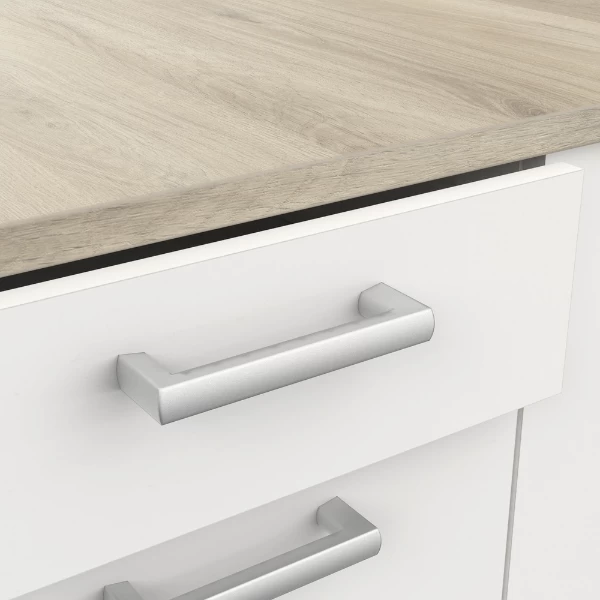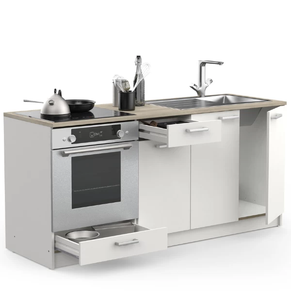 Onderkastcombinatie Chef is gemakkelijk te integreren in bijna elk interieur door zijn neutrale mat witte kleur. De combinatie met het lichte Kronberg eikdecor van het werkblad zorgt voor veel lichtinval in de ruimte. Deze combinatie heeft 2 handige lades voor uw bestek, 1 open legplank voor uw borden en glazen en nog meer opbergruimte achter de 2 draaideuren van de gootsteenonderkast voor sponsjes, vodden en afwasmiddel. De open legplank kan indien gewenst weggehaald worden om plaats te maken voor een standaard inbouwoven van 60 cm met de mogelijkheid om de lade boven of onder de oven te monteren. Het werkblad boven de oven kan verzaagd worden voor de installatie van een kookplaat evenals het werkblad van de gootsteenonderkast voor de installatie van een spoelbak.ย De combinatie kan zowel links als rechts gemonteerd worden.ย ย Apparaten en spoelbak niet inbegrepen.ย Combineer met de hangkast van de chef-collectie en creรซer zo uw eigen stijlvolle, compacte keuken! Vijzen en pluggen voor wandmontage niet inbegrepen.ย