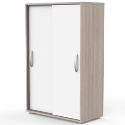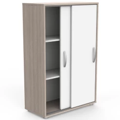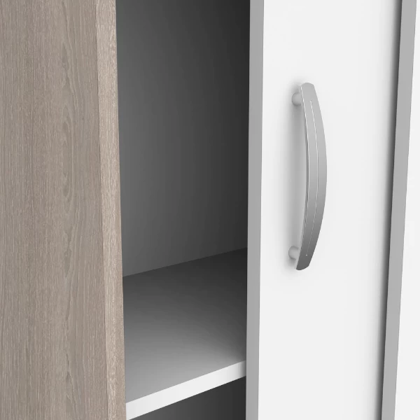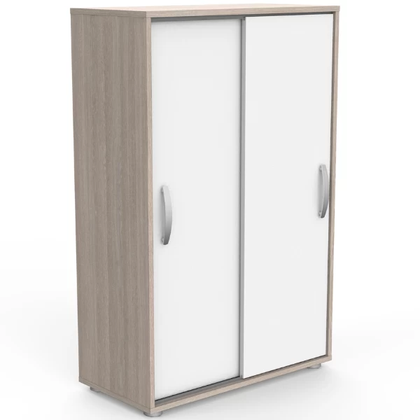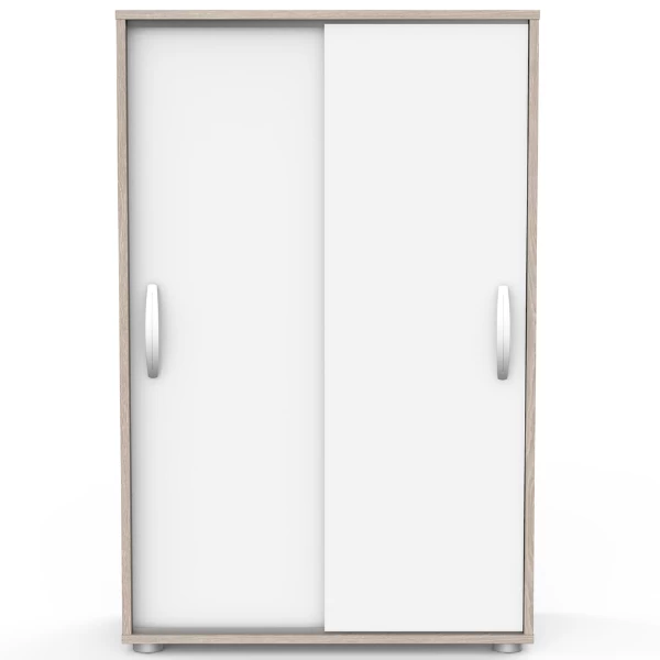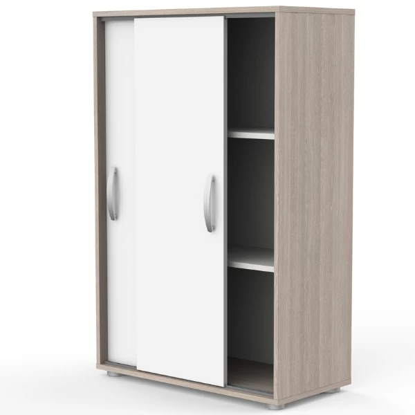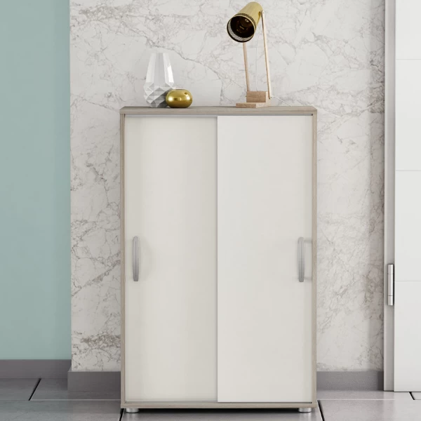 Opbergkast Noni is gemaakt uit gemelamineerde spaanplaat in mat wit en Shannon eikdecor. De kast heeft grijsgelakte handgrepen en ronde aluminumgrijze kunststoffen poten en bestaat uit 2 schuifdeuren en 2 legplanken.