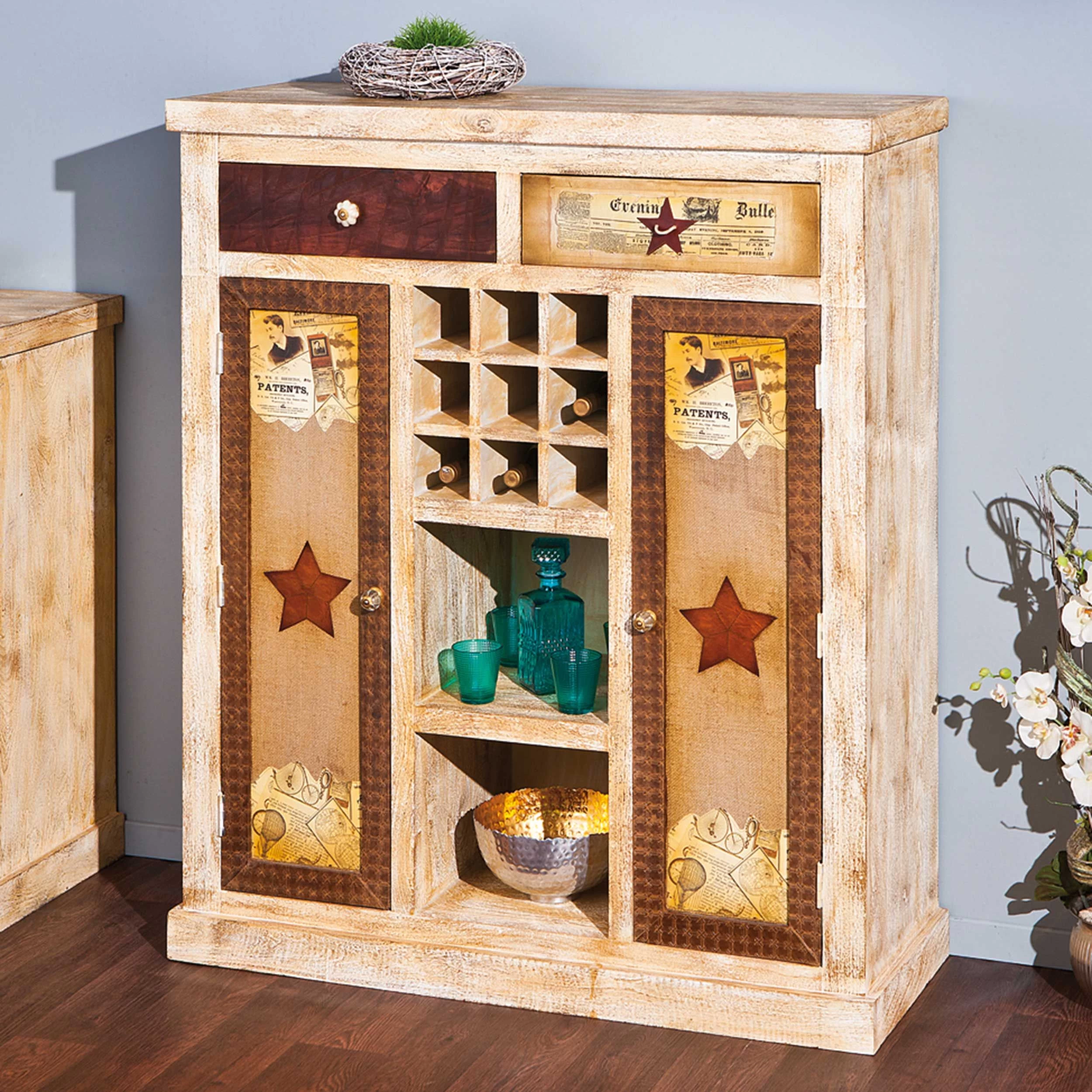 Ga voor een op-en-top vintage interieur met opbergkast Tulsa. Dit hoge model bestaat uit 2 laden met verschillend patroon en handvat. Links en rechts vind je een deurtje waarachter 2 legplanken schuilen. In het midden beschik je over een wijnrek voor 9 flessen en 2 open opbergvakken.