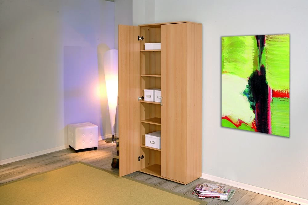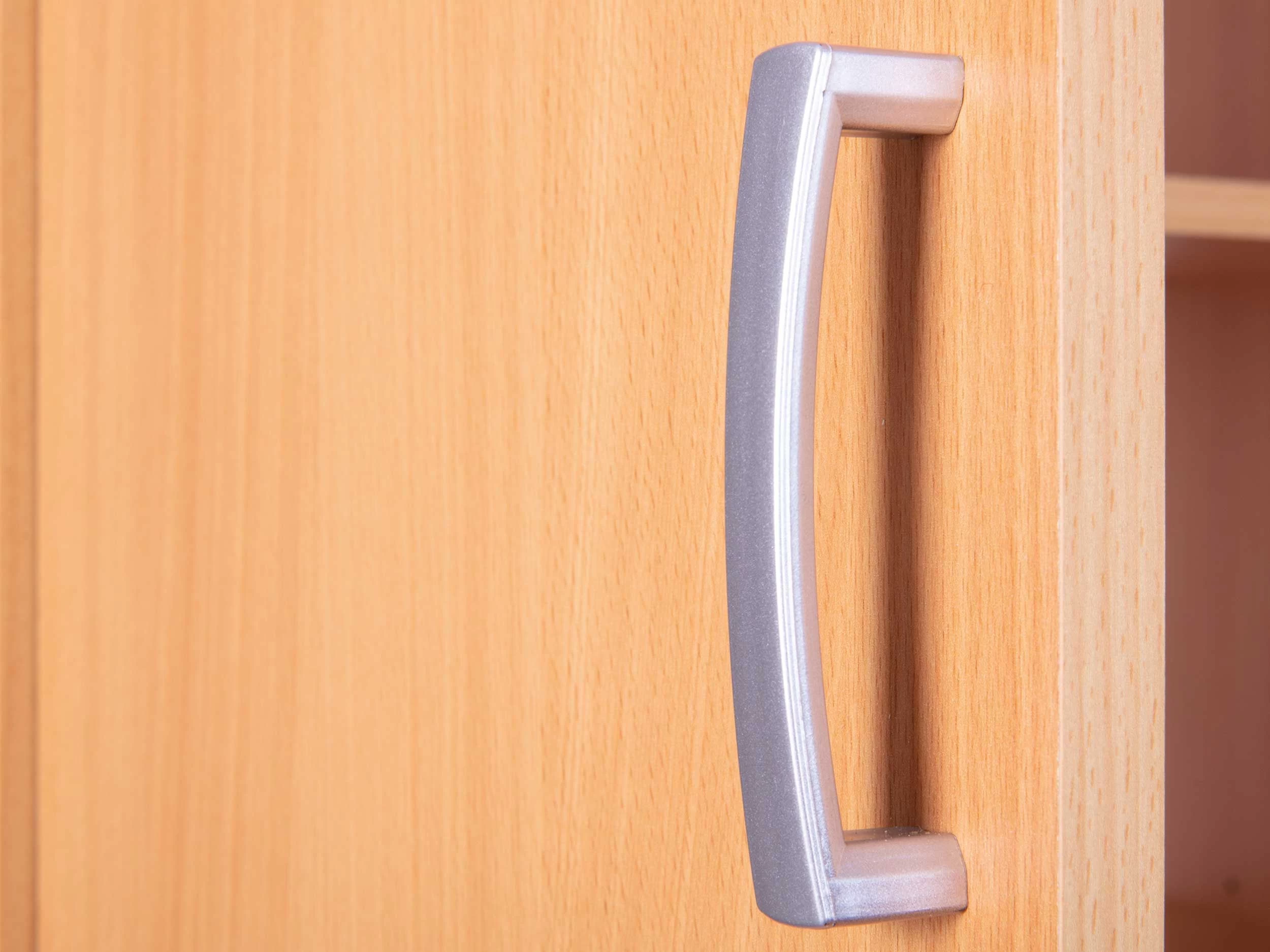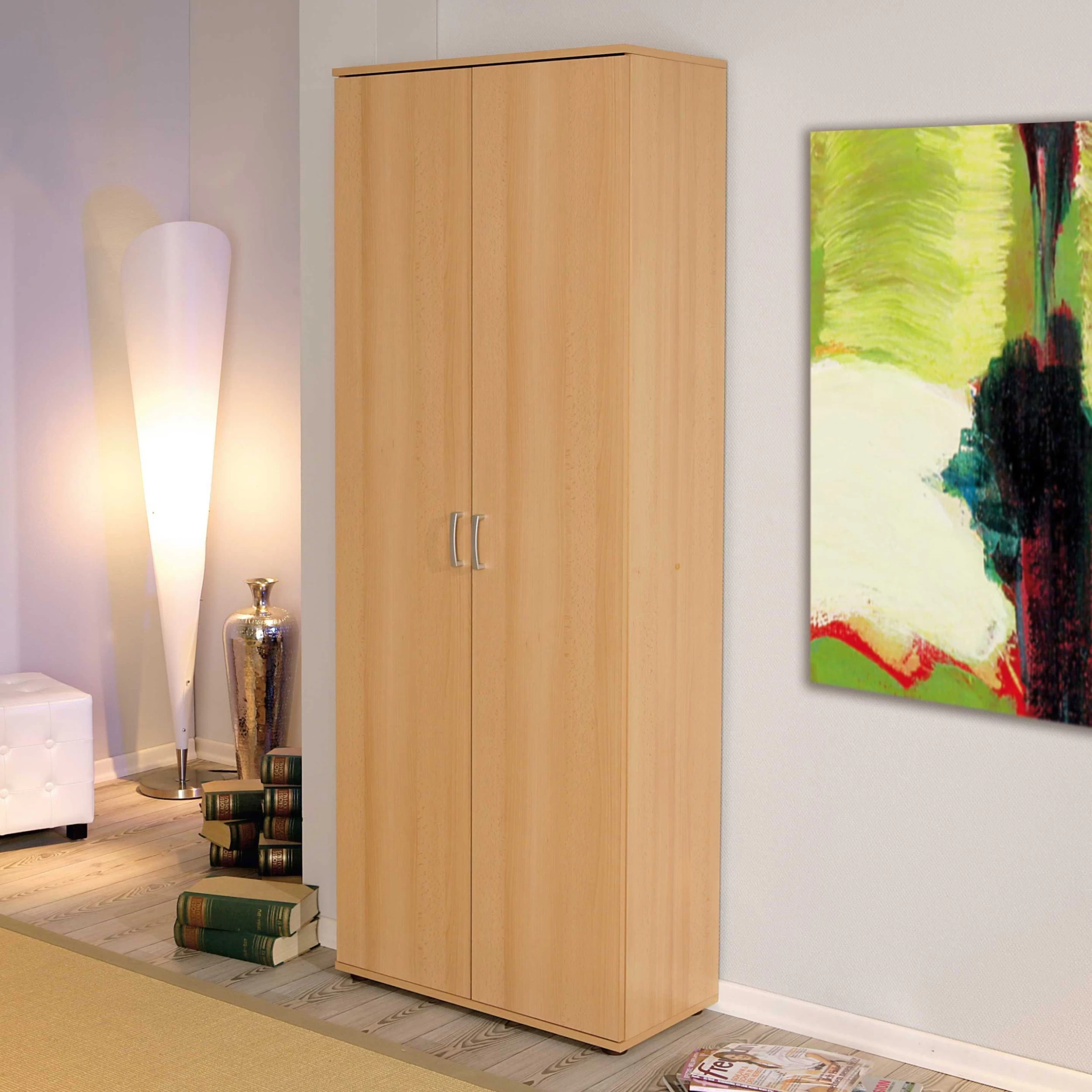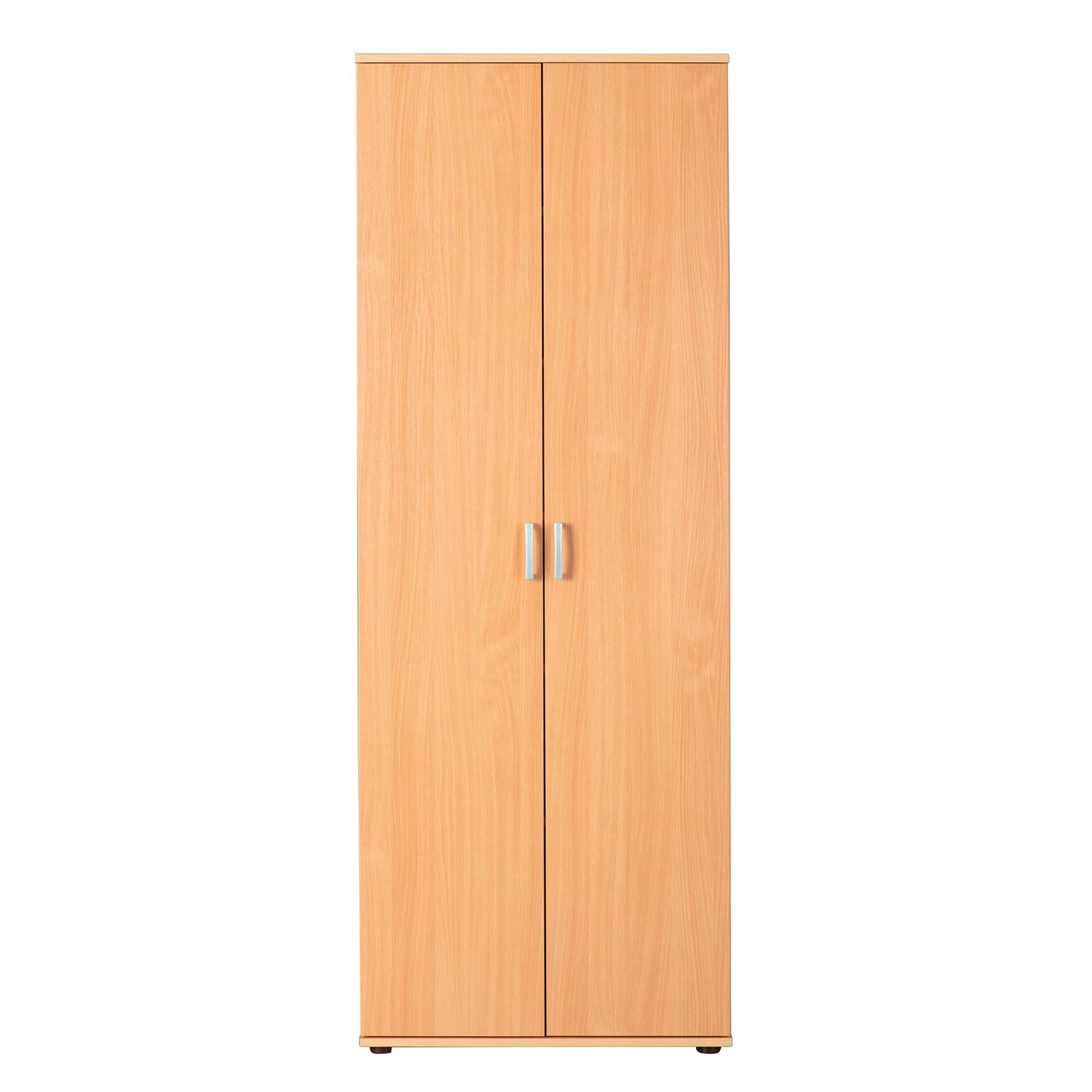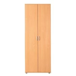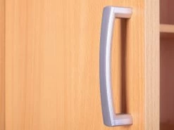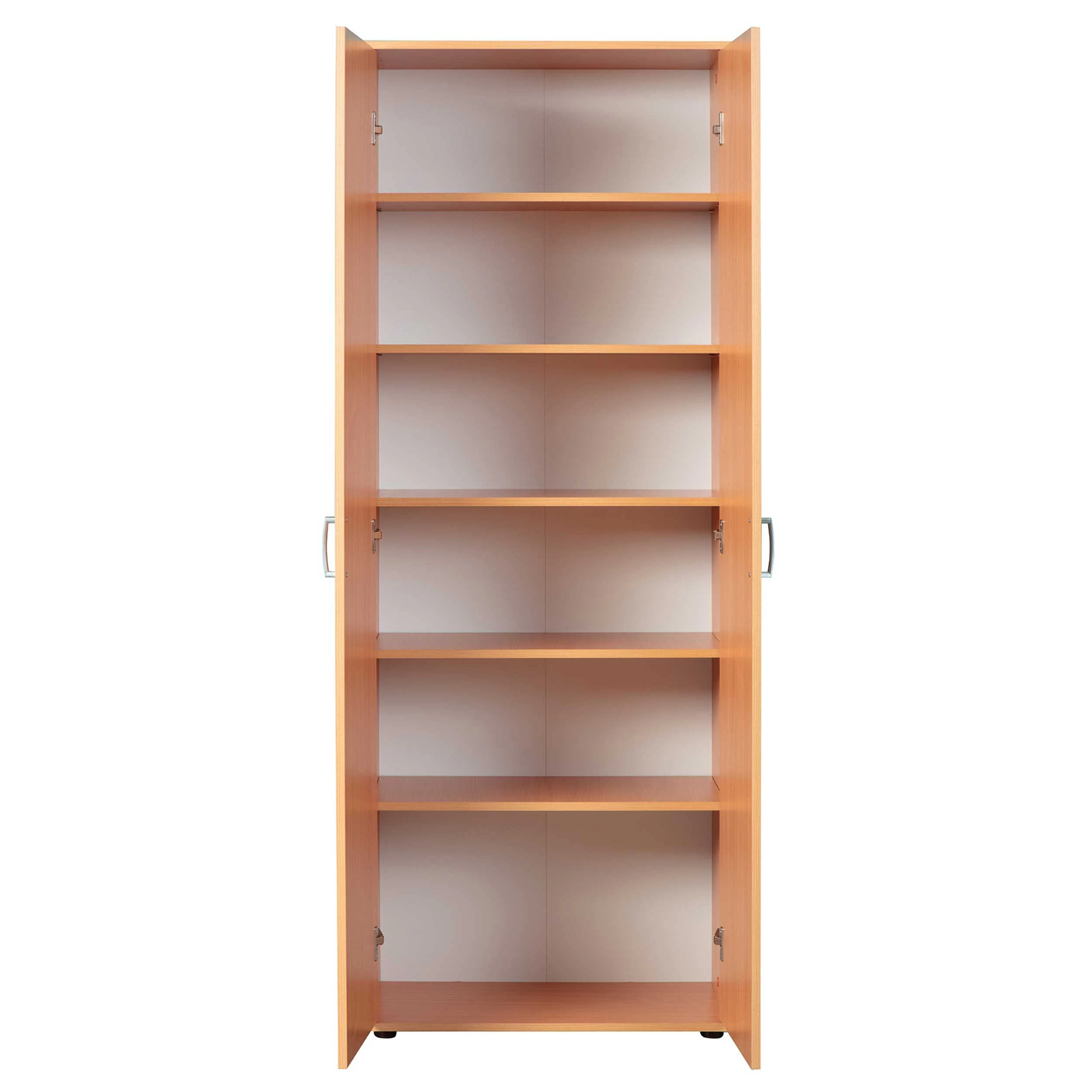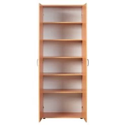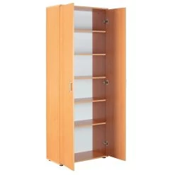 Met opbergkast Vetra wordt rommel in huis verleden tijd. Deze kast bestaat uit 2 deuren en 5 legplanken. Ze is gemaakt van spaanplaat en werd afgewerkt met een laagje melamine met beukdecor. Elke legplank kan je op 3 verschillende hoogtes plaatsen. De handgrepen zijn gemaakt van pvc.