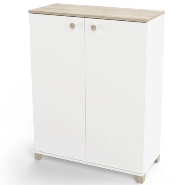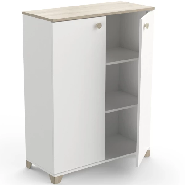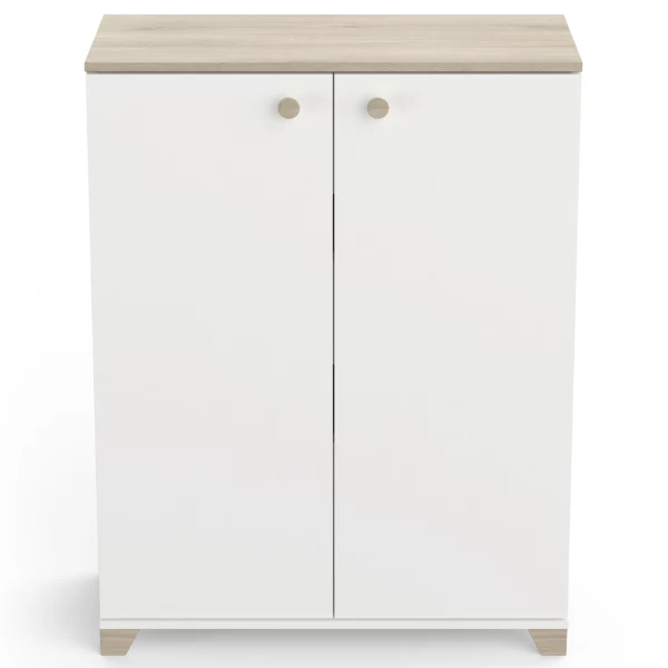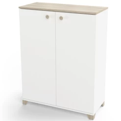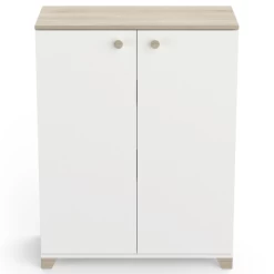 Opbergkastje Liva is gemaakt uit gemelamineerde spaanplaat in Kronberg eikdecor en mat wit. De kast bestaat uit 2 draaideuren en 2 legplanken.