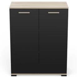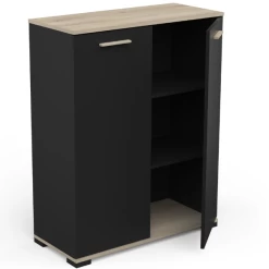 Opbergkastje Liva is gemaakt uit gemelamineerde spaanplaat in Kronberg eikdecor en matzwart. De kast bestaat uit 2 draaideuren en 2 legplanken.