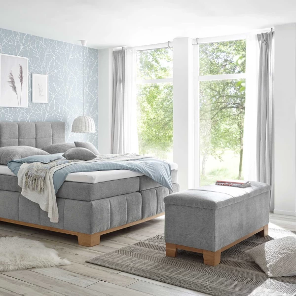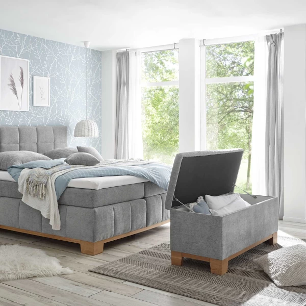 De combinatie van de zachte bekleding en de houten details zorgt ervoor dat de collectie Vikram perfect past in de Scandinavische woontrend. Deze opbergkoffer is gemaakt uit spaanplaat en is bekleed met grijs polyester. De eikenhouten pootjes zorgen voor een warm accent. De koffer biedt handige opbergruimte voor kussens, dekens of andere spullen. De zachte schuimvulling in het deksel zorgt ervoor dat je de koffer ook kunt gebruiken als extra zitplaats. Combineer hem met de boxsprings en nachttafeltjes Vikram in de slaapkamer, of gebruik hem als halbankje.