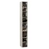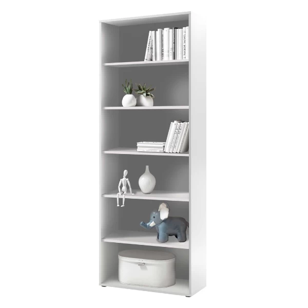 Richt je complete kantoor in met de meubelen van de Sonra-reeks. De kasten zijn gemaakt uit lichtgrijze spaanplaat, wat ervoor zorgt dat de ruimte licht en toch georganiseerd blijft. Dit rek is 80 cm lang en 216 cm hoog. In de zes open vakken kan je spullen opbergen die je dagelijks nodig hebt, eventueel gecombineerd met decoratie.