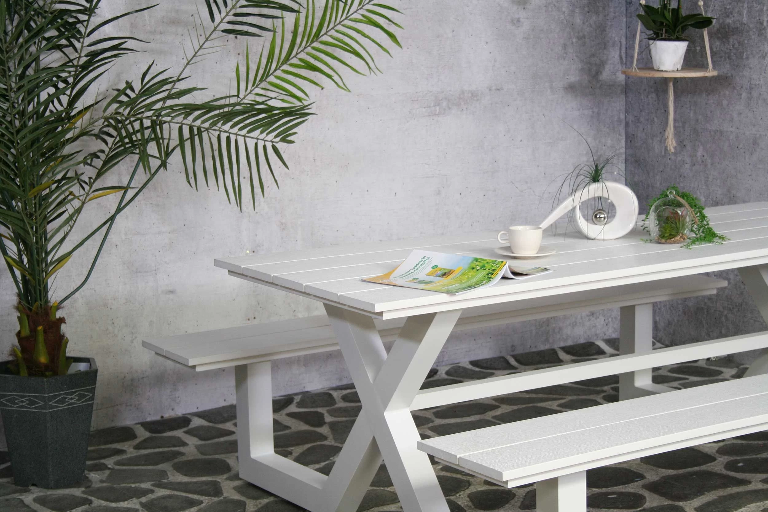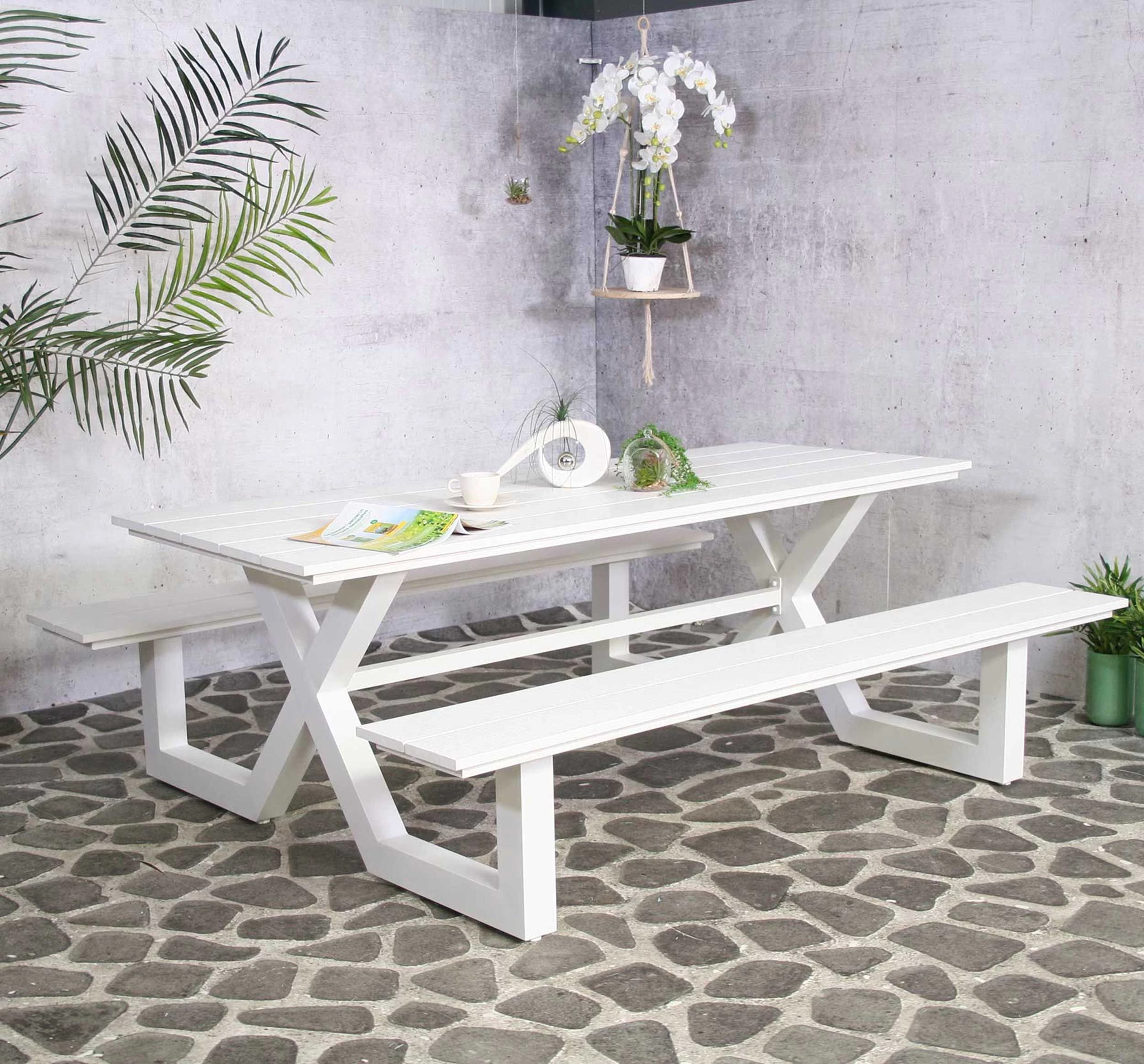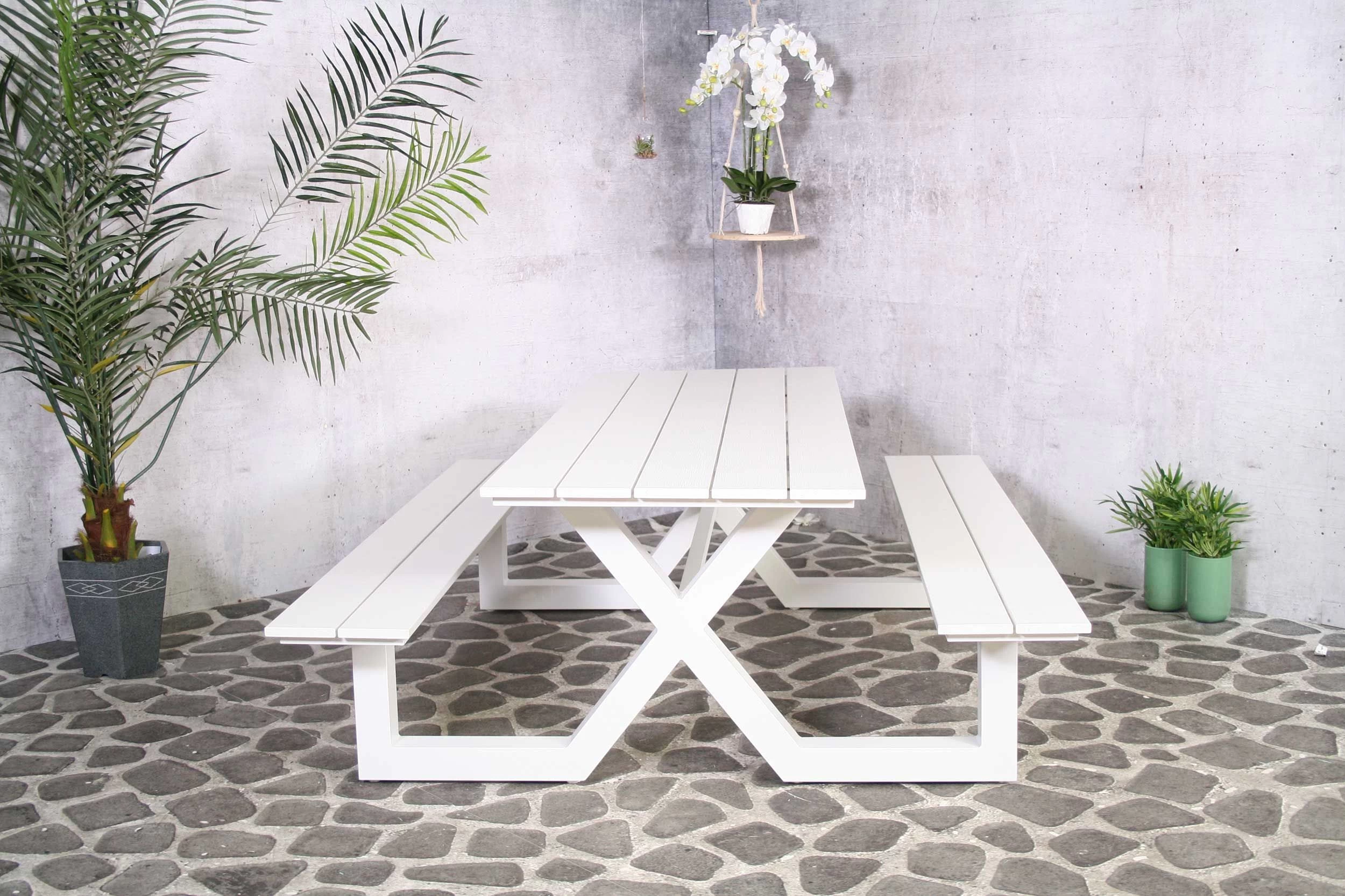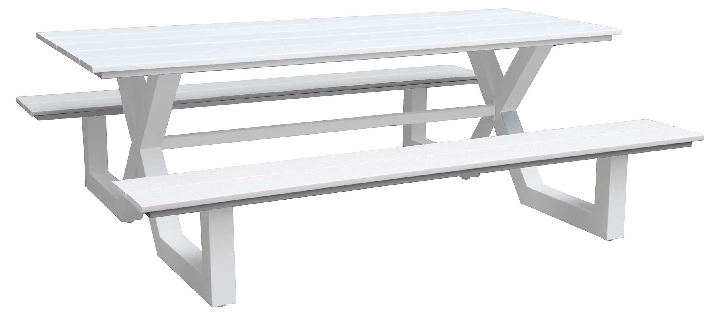Witte picknicktafel Nick vervaardigd uit aluminium met polywood blad en zittingen.
