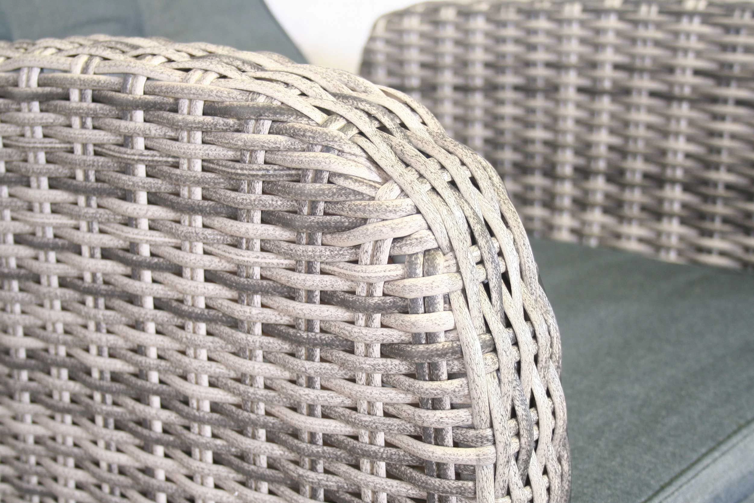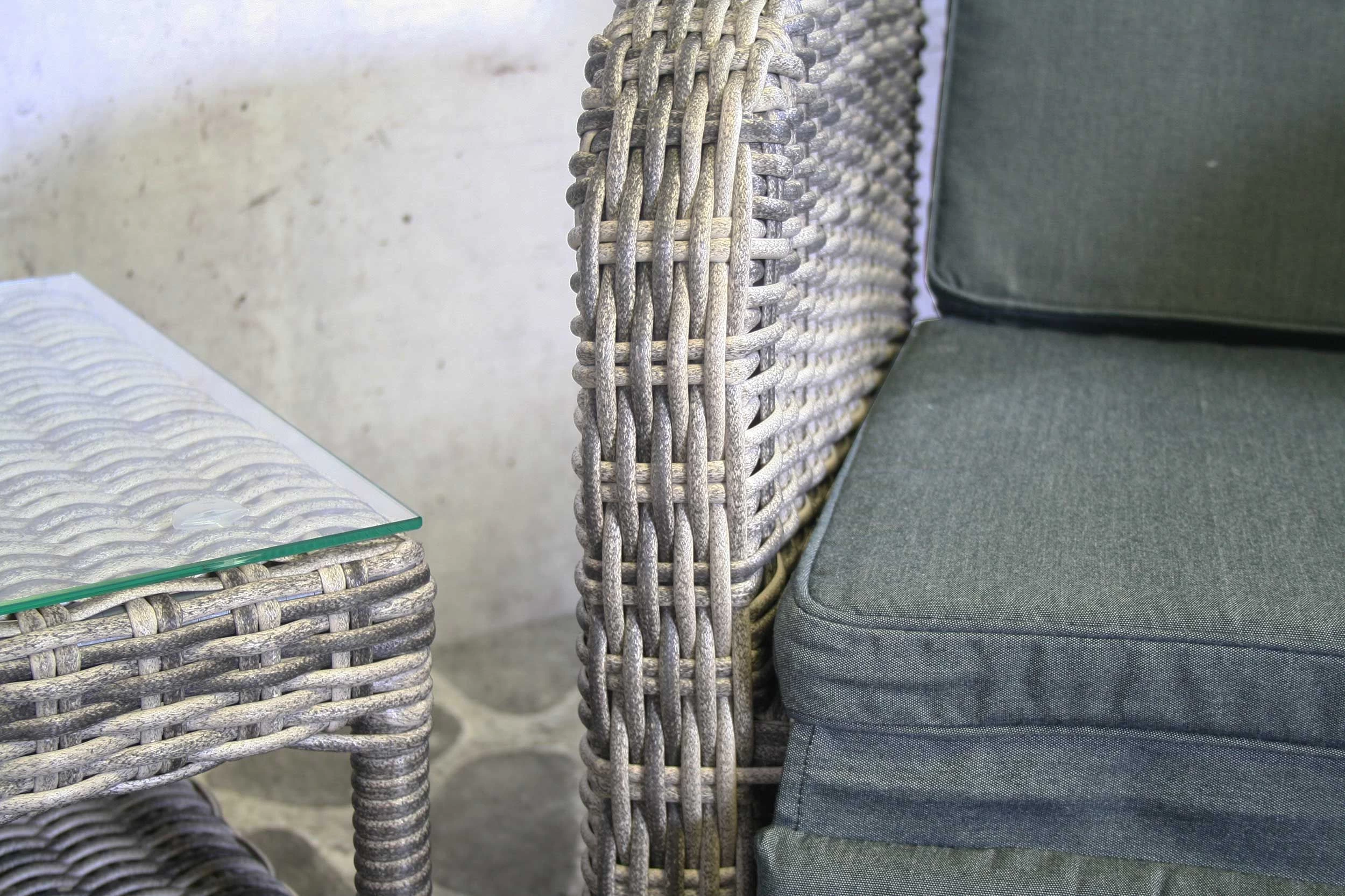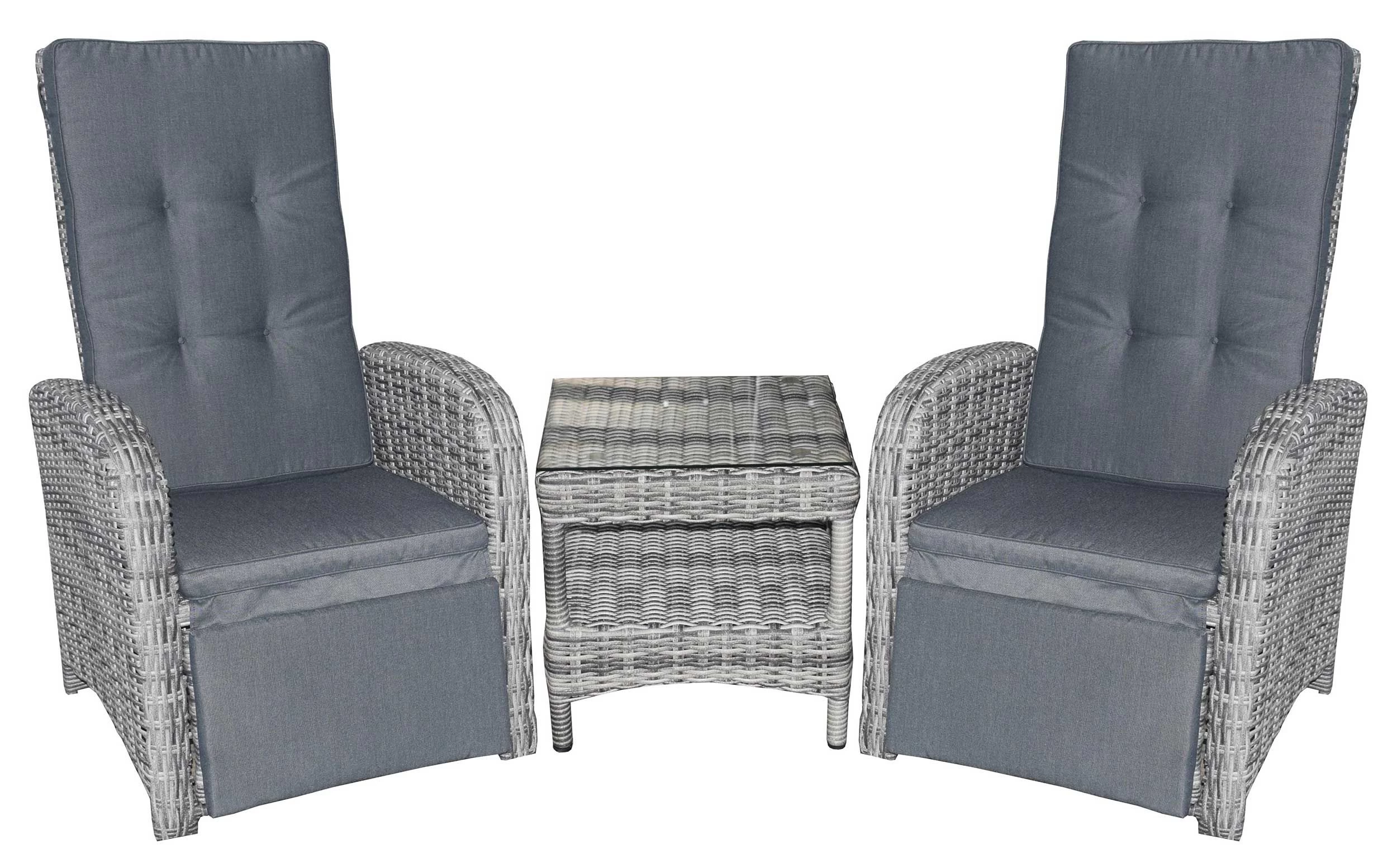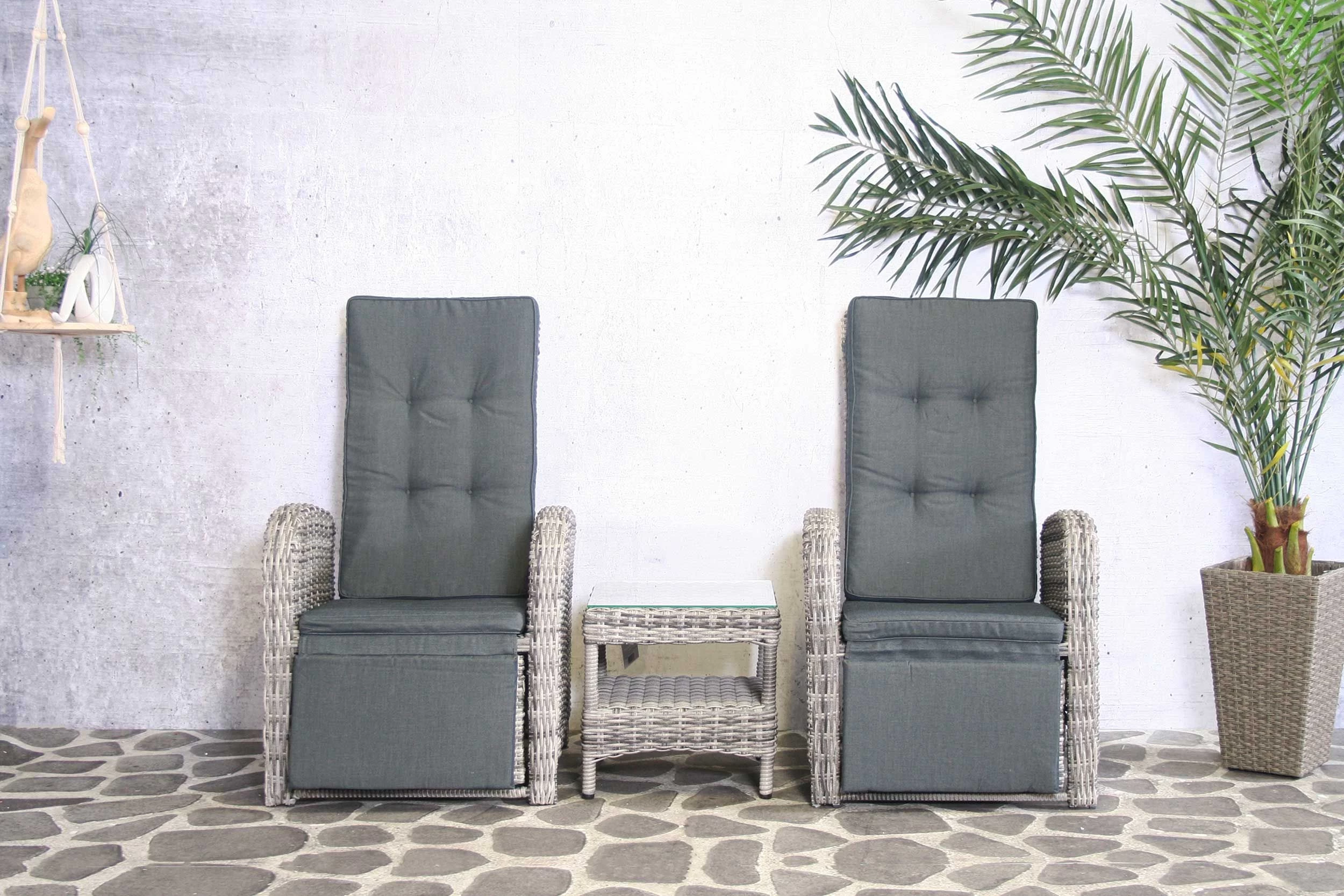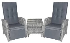 Relaxset met tuinstoelen Garry. Met deze relaxset kan je letterlijk alle kanten uit. De verstelbare rugleuning geeft je de mogelijkheid om precies te zitten zoals jij het wil. Dit meubel is mede door het compacte tafeltje (45x45cm) met glazen blad uitermate geschikt om warme zomeravonden met z’n tweetjes in door te brengen. Naast een stevig frame in aluminium, is de set afgewerkt in rond en halfrond wicker. De comfortabele waterresistente kussens in polyester maken het meubel volledig af. Bereid je al maar voor op een uitgebreid aperitief in het zonnetje!
