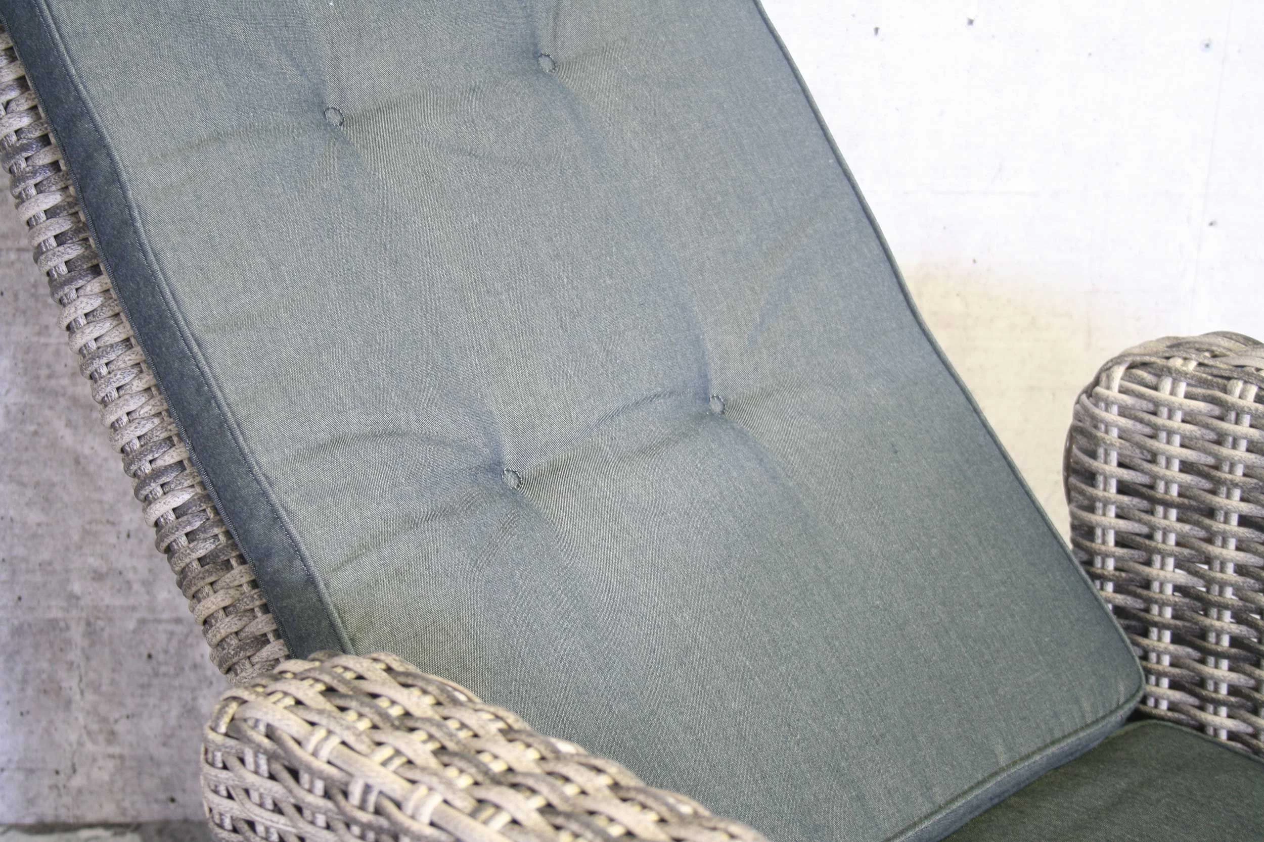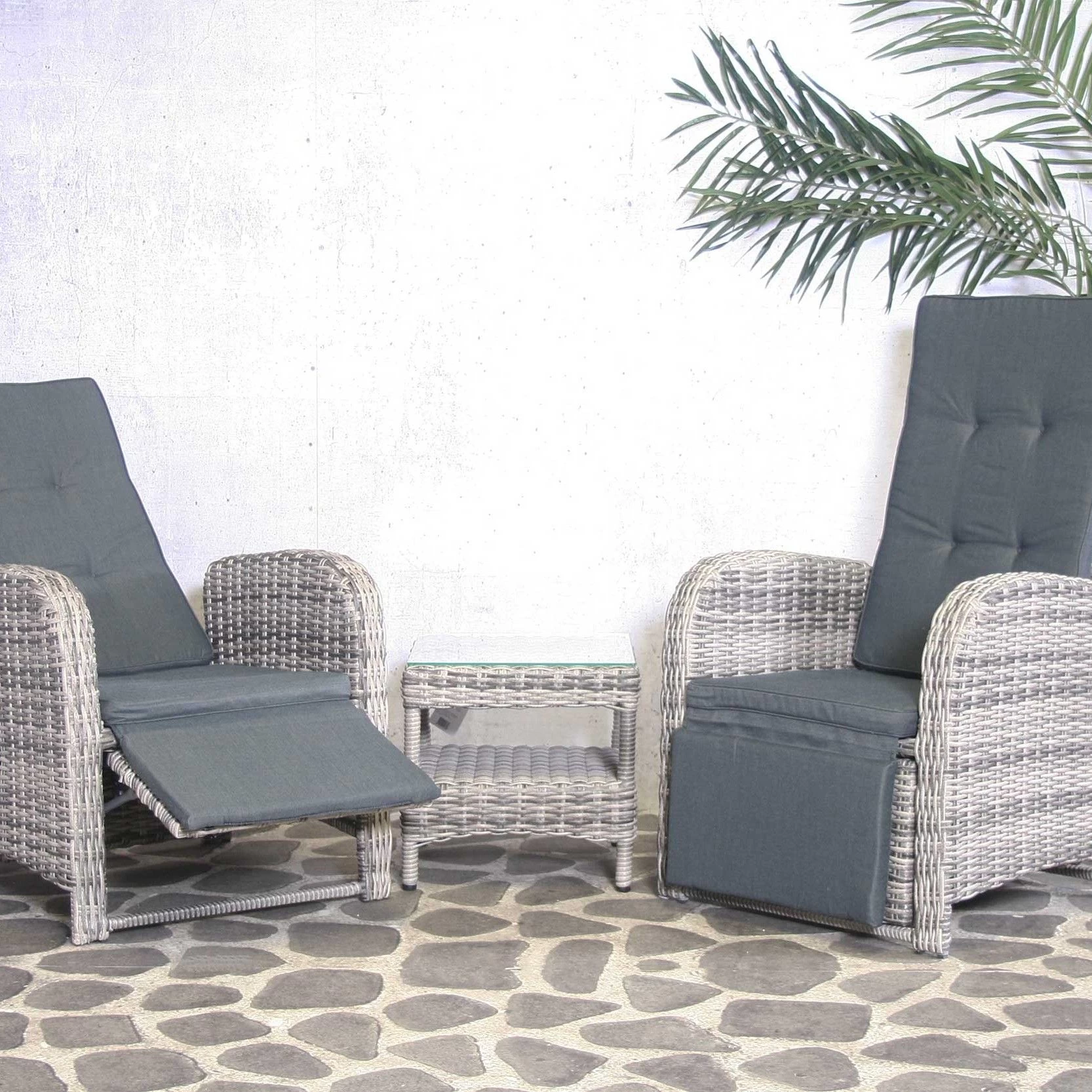 Relaxset tuinstoelen Garry met verstelbare rugleuning. Het frame bestaat uit aluminium, de bekleding is in wicker, het tafelblad in glas. De waterresistente kussens in polyester zijn inbegrepen.