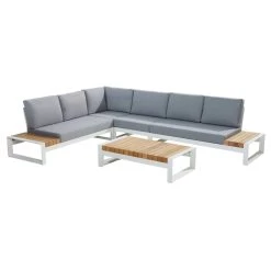 Kom tot rust in je tuin met de prachtige tuinmeubelen van de Plata-collectie. Deze salontafel voor buiten is gemaakt uit een onderstel van witte aluminium met een tafelblad uit massief teakhout. Deze materialen zijn allebei heel duurzaam en bestendig tegen alle weersomstandigheden. Je kan deze salontafel gebruiken bij je loungezetel of tussen twee ligzetels aan het zwembad. De salontafel meet 120 cm lang, 65 cm breed en 32 cm hoog.