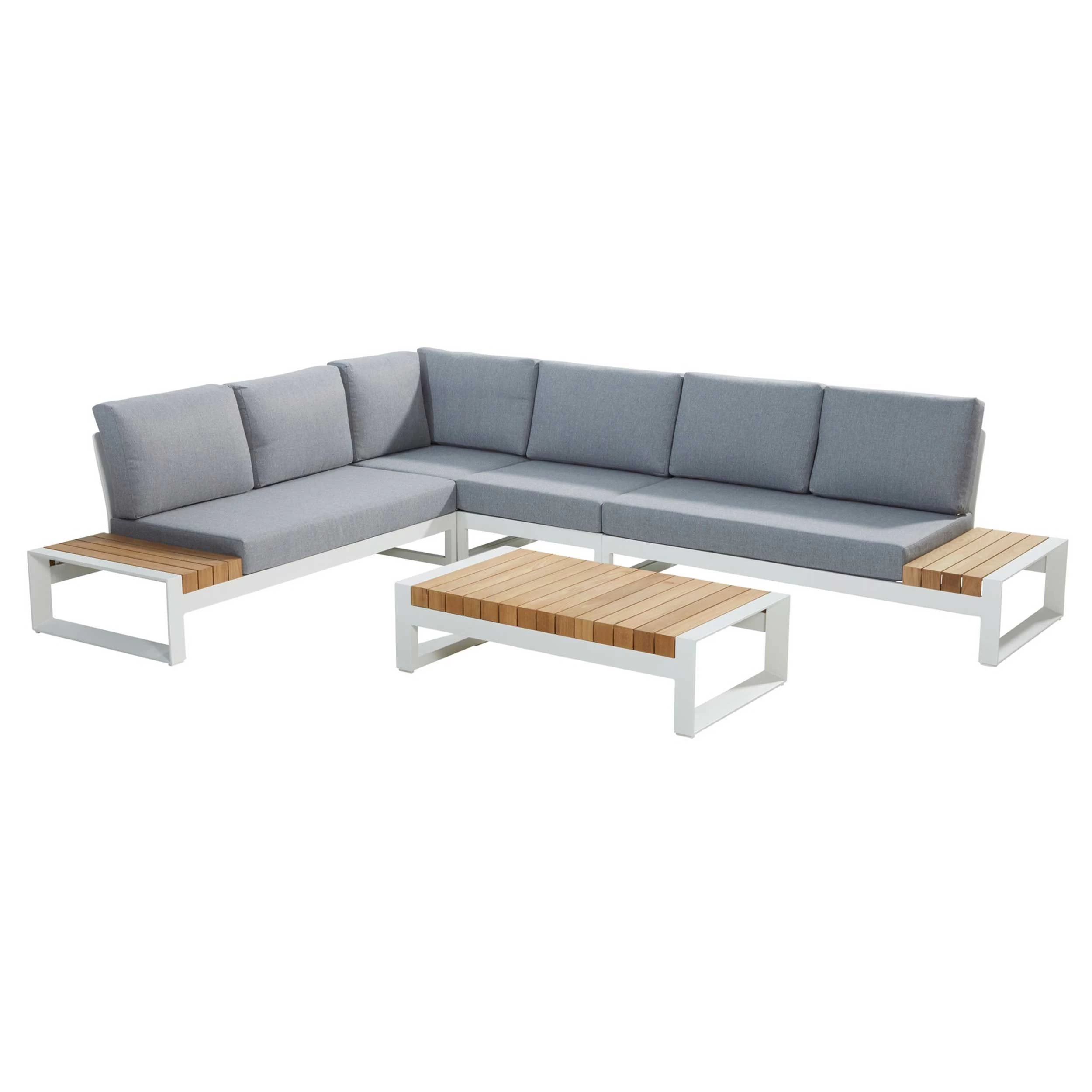 Salontafel voor buiten Plata, gemaakt uit een onderstel van witte aluminium met een tafelblad uit massief teakhout.