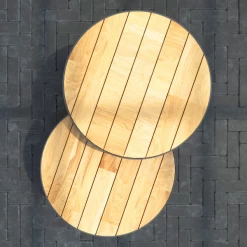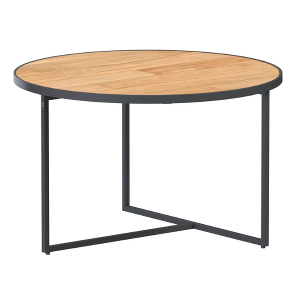 Salontafel voor buiten met een diameter van 73cm uit roestvrij staal met een tafelblad uit teakhout.