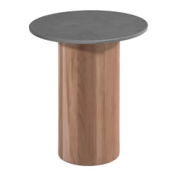 Salontafel voor buiten Viola Ø42x47cm met een voet uit teakhout en een tafelblad uit gesinterde steen.