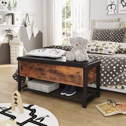 Ga zitten, neem je schoenen van de legplank en trek ze aan met alle gemak. Deze schoenenbank is gemaakt van metaal en heeft een kastje uit rustiek bruin spaanplaat, waarin je ook wat andere spullen kunt opbergen. De prachtig gestoffeerde zitting van de bank is uit kunstleer. Belastbaar gewicht: 120 kg