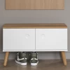 Schoenenbank Bill met kunstlederen zitting, kastje en legplank. Gemaakt van spaanplaat en metaal.