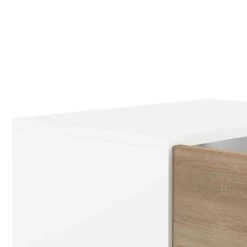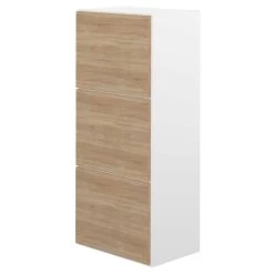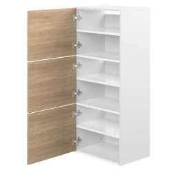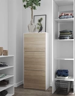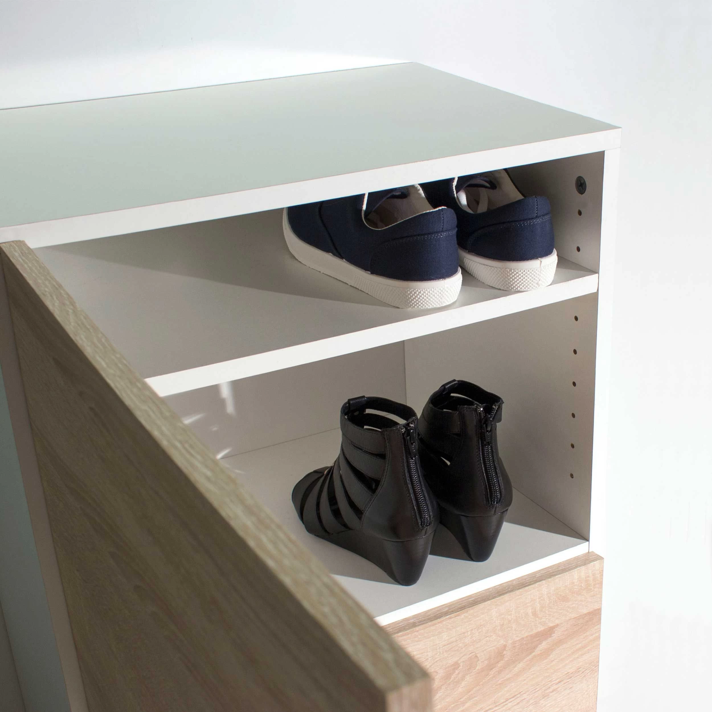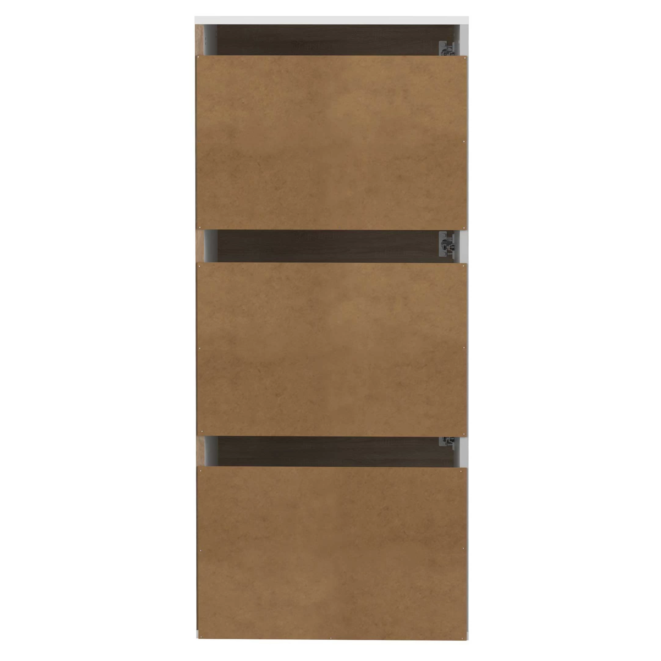 Witte schoenenkast Bamboo met 3 deuren in eikdecor en 5 legplanken. Gemaakt van spaanplaat.