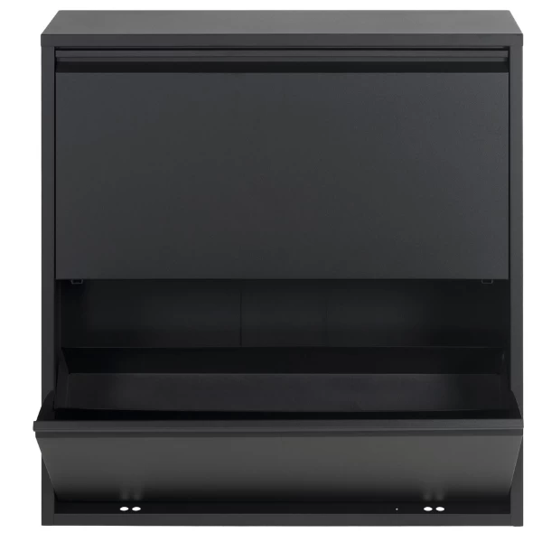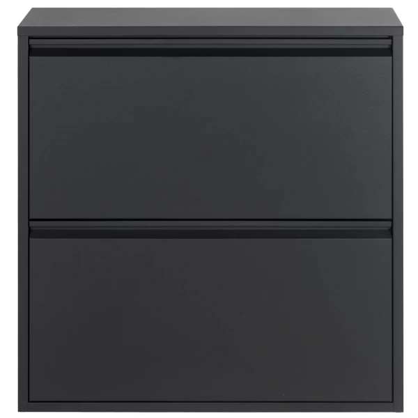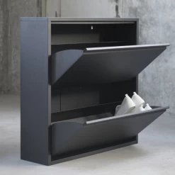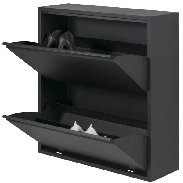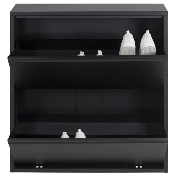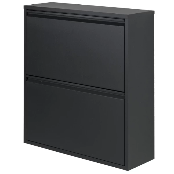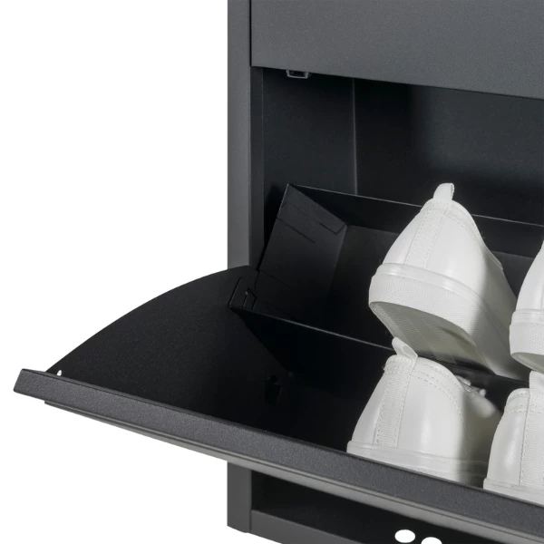 Schoenenkast Bente is gemaakt uit gepoedercoat staal en bestaat uit 2 opklapdeuren met daarachter 4 opbergvakken in het totaal voor een 12-tal paar schoenen.