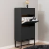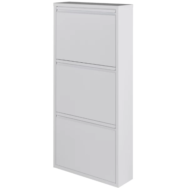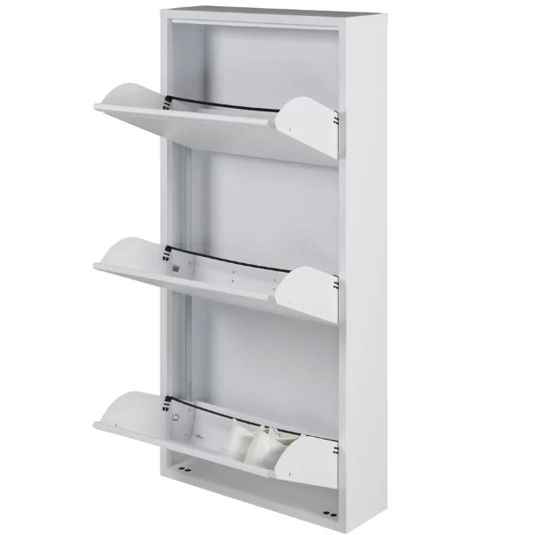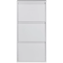 Schoenenkast Bente is gemaakt uit gepoedercoat staal en bestaat uit 3 opklapdeuren met daarachter 3 opbergvakken in het totaal voor een 6-tal paar schoenen.