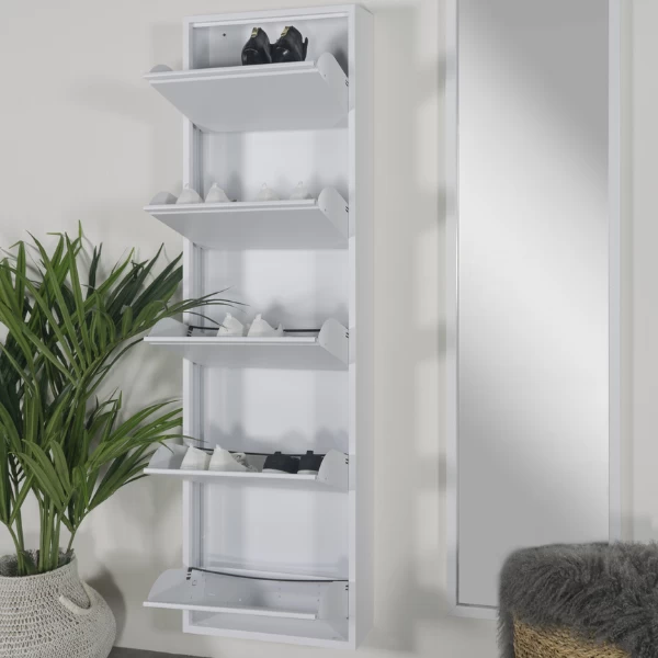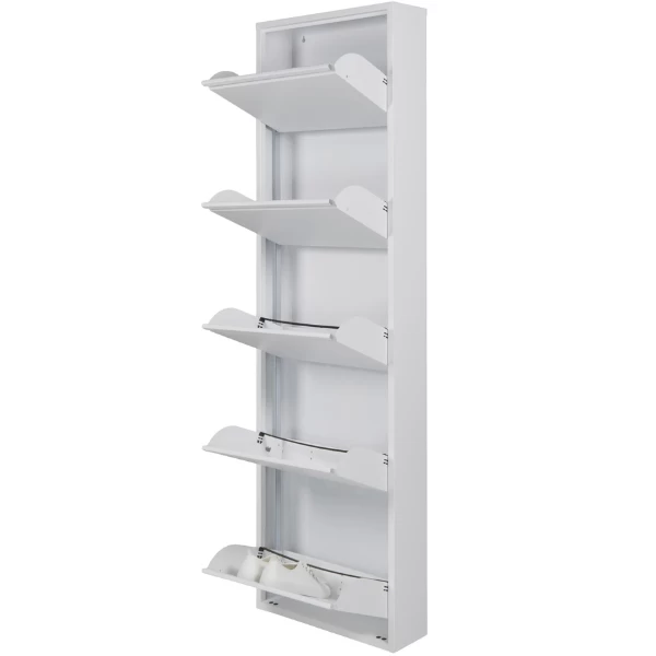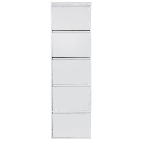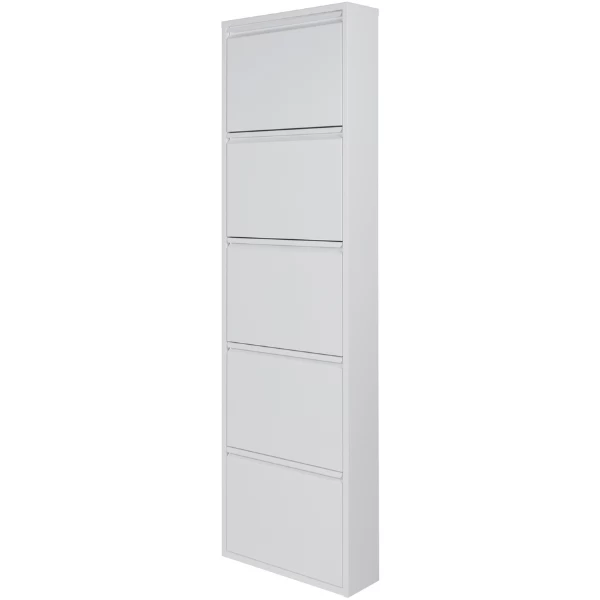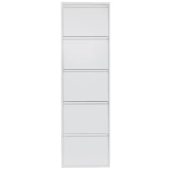 Schoenenkast Bente is gemaakt uit gepoedercoat staal en bestaat uit 5 opklapdeuren met daarachter 5 opbergvakken in het totaal voor een 10-tal paar schoenen.