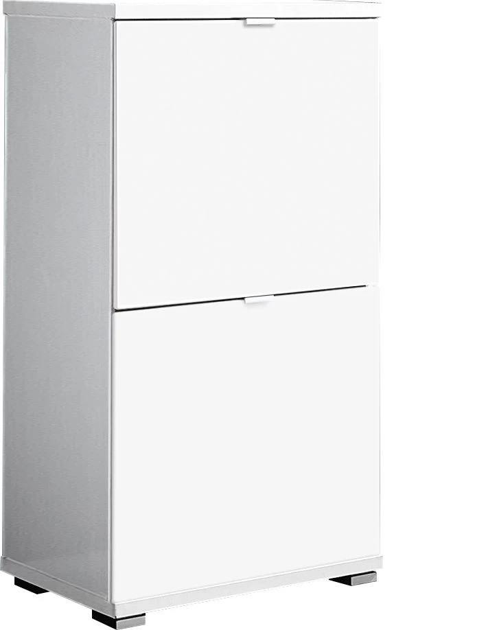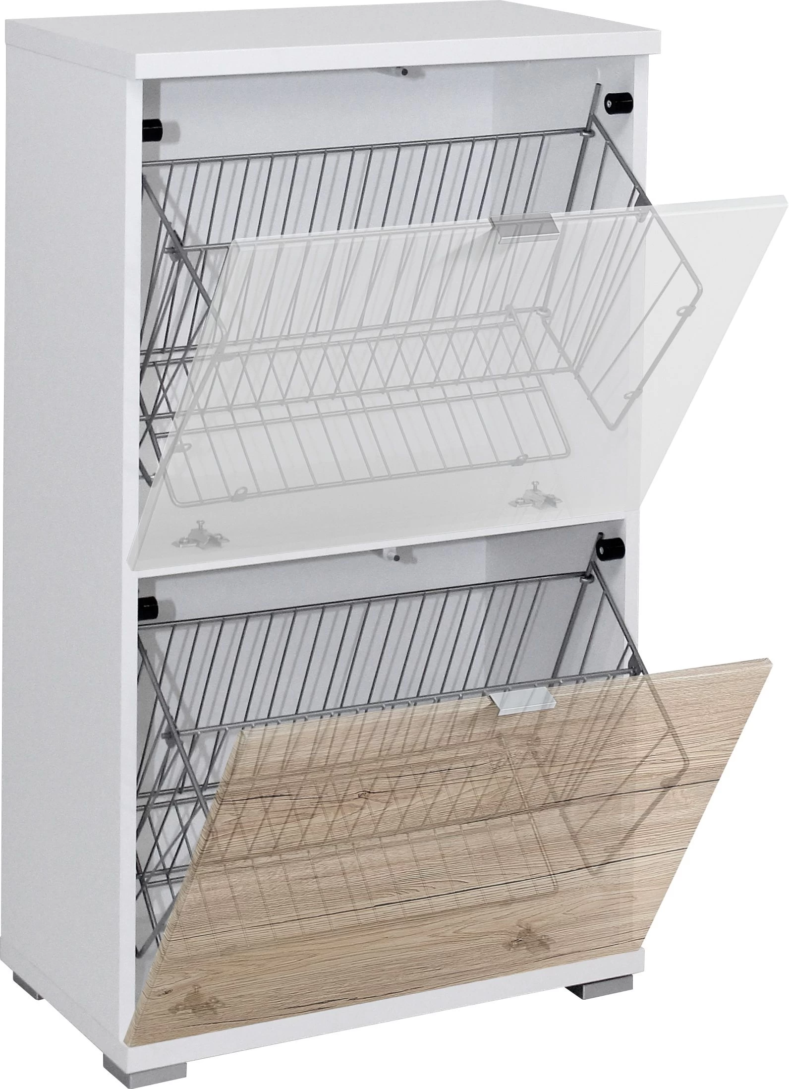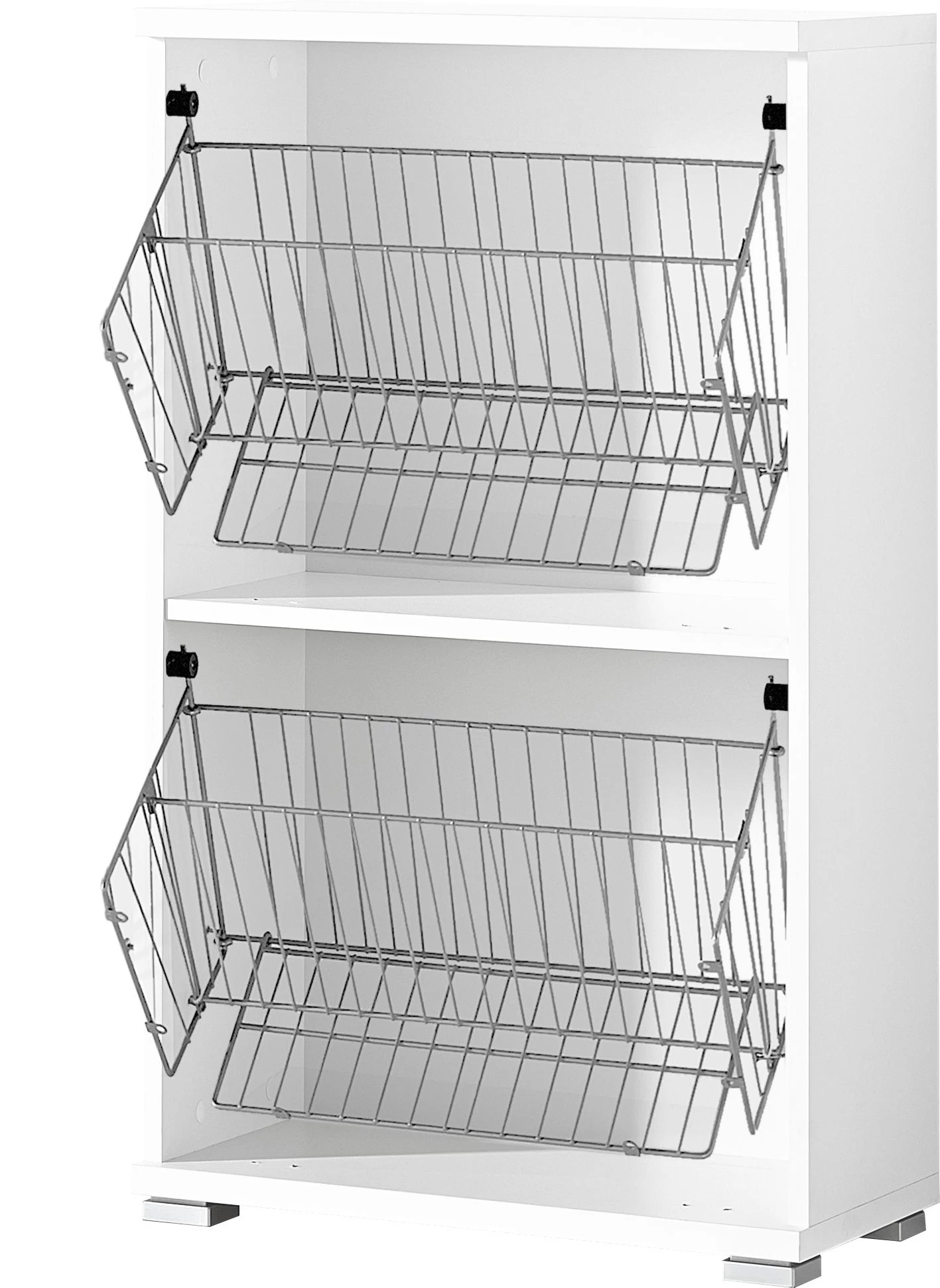 Deze compacte schoenenkast past perfect in elke inkomhal. De twee geïntegreerde metalen schoenenmandjes bieden plaats aan ongeveer acht paar schoenen.