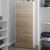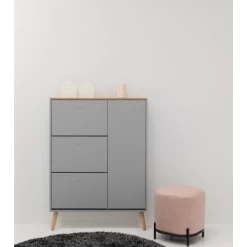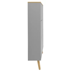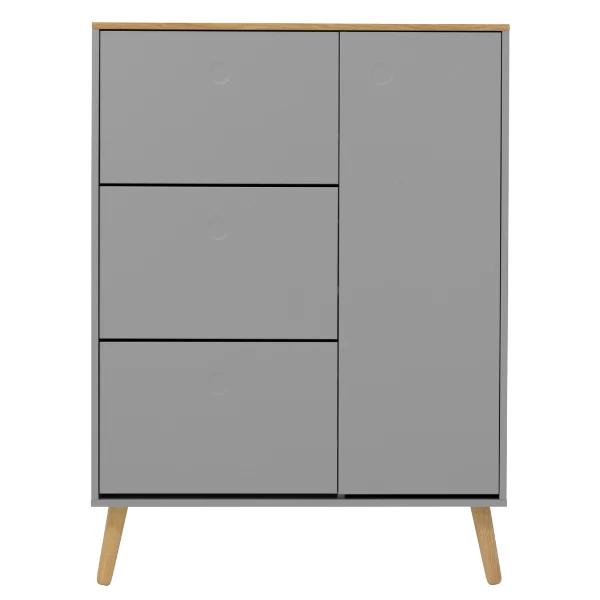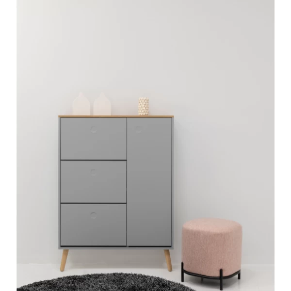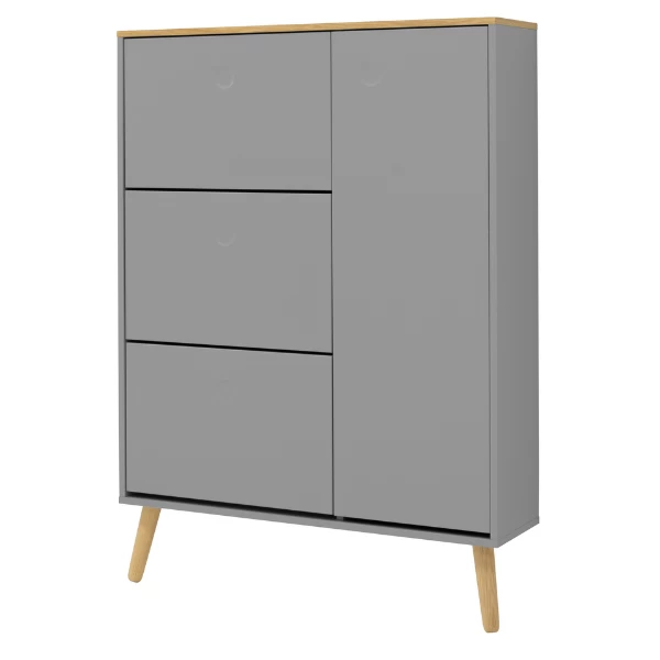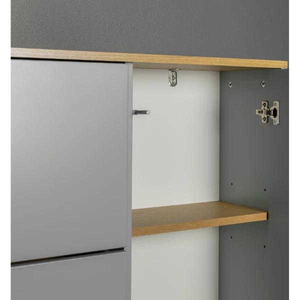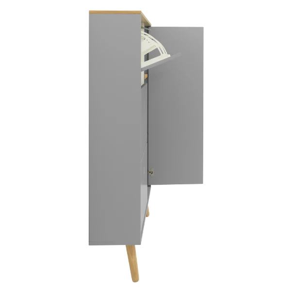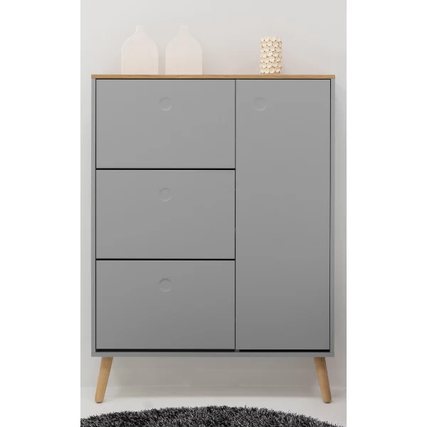 Deze schoenenkast beschikt over 3 vakken. Deze vakken zijn telkens met een plank in tweeën verdeeld. Ieder vak biedt plaats aan 4 à 5 paar schoenen. In totaal is er dus plaats voor 12 tot 15 paar schoenen. Deze kast beschikt daarnaast over nog een extra ruimte (58x24x128 cm) die met 2 verstelbare legplanken uitgerust is en die gebruikt kan worden om sjaals, hoeden, mutsen en dergelijke in op te bergen. De bovenkant van deze kast en de legplanken zijn voorzien van een eikendecor. De deur en de voorkant van de vakken zijn gemaakt uit grijsgelakt MDF en zijn uitgerust met een push-to-open-systeem. De poten van deze schoenenkast (18,3 cm) zijn gemaakt uit massief eikenhout en dienen jaarlijks met houtolie behandeld te worden.