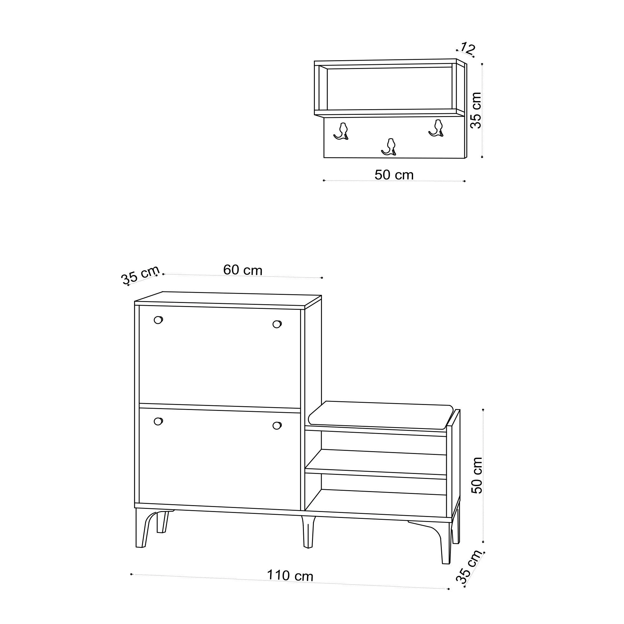 Qua afmetingen heeft de Emerald Schoenenkast een breedte van 110 cm, een hoogte van 92 cm en een diepte van 35 cm. Dit formaat is perfect voor een breed scala aan schoenmaten en stijlen en biedt voldoende opbergruimte voor je hele schoenencollectie. Daarnaast wordt het geleverd met een hangende kapstok met afmetingen van 50 cm (breedte), 35 cm (hoogte) en 12 cm (diepte), die een handige plek biedt om je jassen of andere accessoires op te hangen.