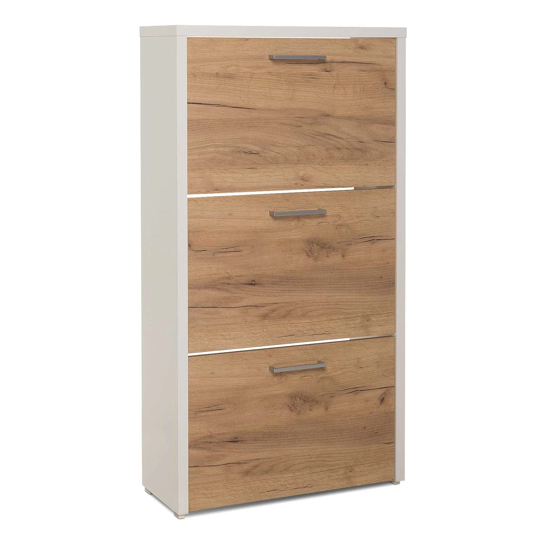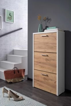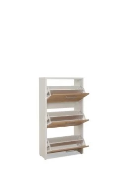 Deze schoenenkast beschikt over 3 laden en is geschikt voor 18 paar schoenen (tot schoenmaat 45). Schoenenkast Fulda is gemaakt van spaanplaat (25 mm dik) en is afgewerkt in het wit. De laden kregen een warm eikdecor.