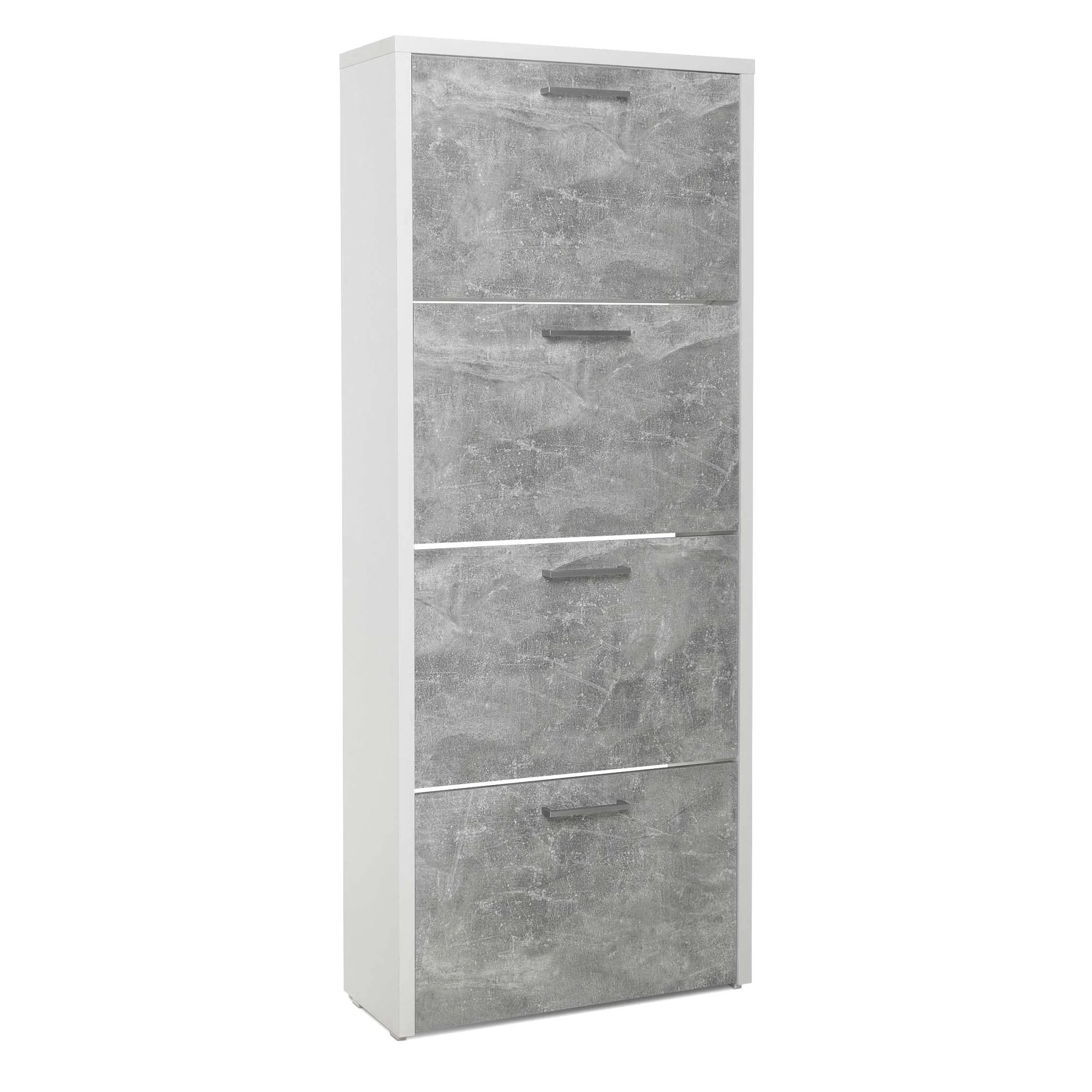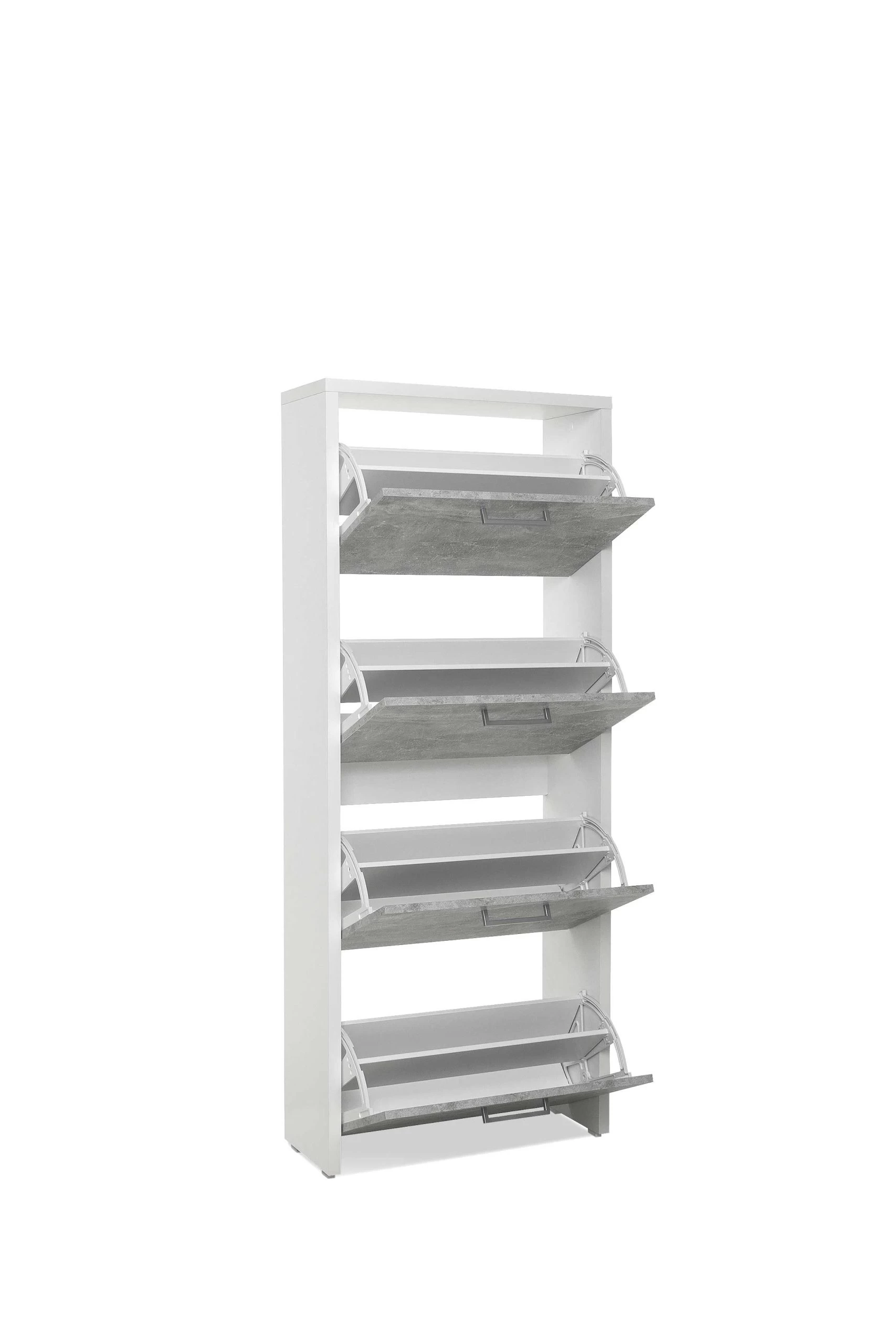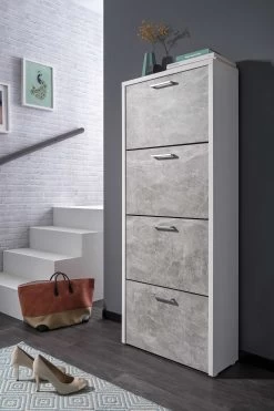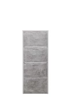 Deze schoenenkast beschikt over 4 laden en is geschikt voor 24 paar schoenen (tot schoenmaat 45). Schoenenkast Fulda is gemaakt van spaanplaat (25 mm dik) en is afgewerkt in het wit. De laden kregen een moderne betonlook.