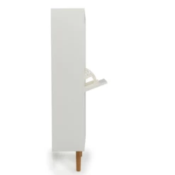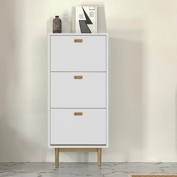 Schoenenkast Horanka zal bij liefhebbers van de Scandinavische stijl zeker in de smaak vallen. Het eenvoudige design, de lichte witte kleur en de warme geoliede eikenhouten accenten maken het meubel tot een harmonieus geheel. De kast bestaat uit 3 opklapdeuren met elk 2 opbergvakken voor uw schoenen. Het meubel dient aan de muur bevestigd te worden zodat deze niet kan omvallen. Bekijk onze website voor nog meer van de Horanka collectie.