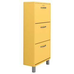 Deze schoenenkast beschikt over 3 vakken. Deze vakken zijn telkens met een plank in tweeën verdeeld. Ieder vak biedt plaats aan 4 à 5 paar schoenen. De boven- en onderkant van deze kast zijn gemaakt uit geelgelakt MDF, de achterkant is gemaakt uit hardboard, en de voorkant en de zijkanten zijn gemaakt uit spaanplaat en zijn afgewerkt met een geel melaminelaagje.