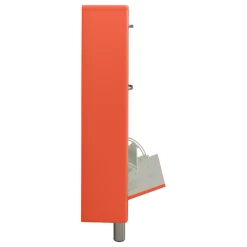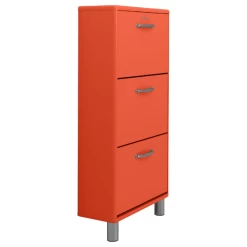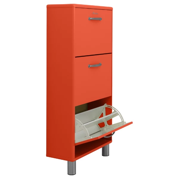 Deze schoenenkast beschikt over 3 vakken. Deze vakken zijn telkens met een plank in tweeën verdeeld. Ieder vak biedt plaats aan 4 à 5 paar schoenen. De boven- en onderkant van deze kast zijn gemaakt uit roodgelakt MDF, de achterkant is gemaakt uit hardboard, en de voorkant en de zijkanten zijn gemaakt uit spaanplaat en zijn afgewerkt met een rood melaminelaagje.