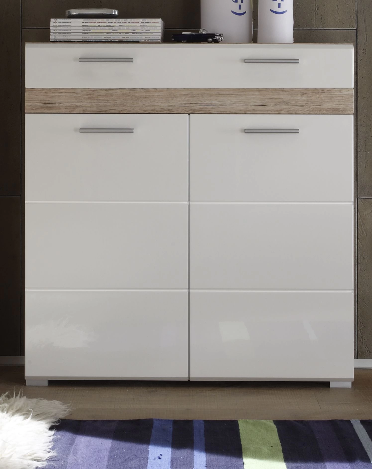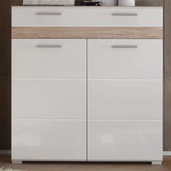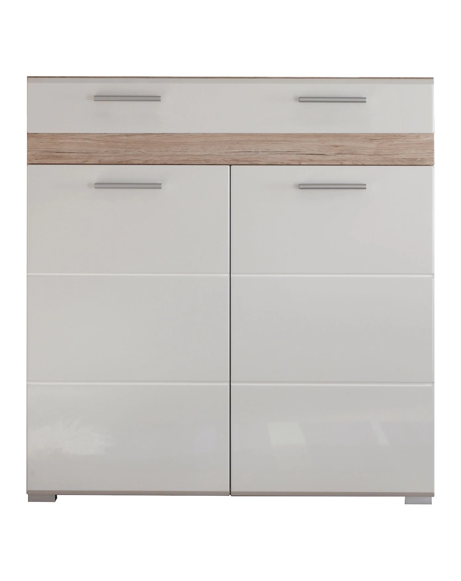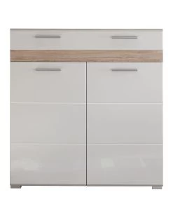 Onze schoenenkast Set-One is middelgroot en biedt voldoende opbergruimte zonder al te veel ruimte in beslag te nemen. Het robuuste oppervlak met decoratieve folie garandeert duurzaamheid en een lange levensduur. De combinatie van het licht-eiken San Remo-decor met de decoratieve hoogglans voorkant zorgt voor een strak en modern ontwerp.