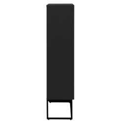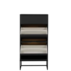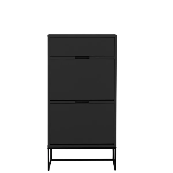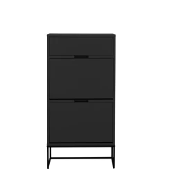 Schoenenkast Trend heeft door zijn rechte lijnen en uitgesneden handgrepen een strakke en moderne stijl. Het meubel past perfect binnen een minimalistisch interieur waar stijl en functie op de voorgrond treden zonder te veel poespas. De zwarte kleur straalt klasse uit. De kast heeft 1 zelfsluitende lade waarbij de lade bij het sluiten naar binnen wordt getrokken en 2 opklapdeuren met elk 2 opbergvakken voor schoenen. De lade heeft een stijlvolle linnenlook aan de zijkant. De kast dient aan de muur bevestigd te worden zodat deze niet omvalt. Bekijk ook de andere meubels van de trend collectie op onze website.