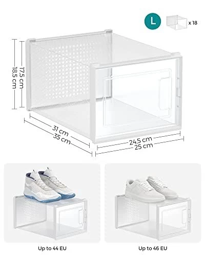 K.O. de rommel met dit pak van 18 klassieke schoenendozen! Transparant en wit, met een doorzichtige voordeur voor een blik in de toren van schoenen en een stapelbaar en opvouwbaar ontwerp voor maximale opslagruimte. UK maat 12. Opzetten is een fluitje van een cent; stapel ze op elkaar voor ademende orde. Pak de chaos van schoenen opbergen aan en blijf in stijl!