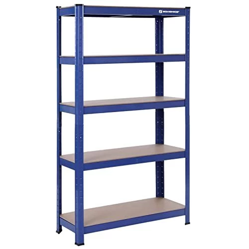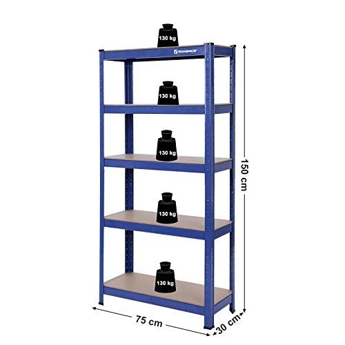 Stalen stellingkast met 5 etages | Montage zonder gereedschap | 650 kg draagvermogen | Garage, berging | 30 x 75 x 150 cm | BlauwZware en stabiele stellingkast met verstelbare planken, deelbaar en belastbaar tot 650 kg. Inclusief montage zonder gereedschap en anti-tip kit: 150 x 75 x 30 cm | MDF Formaat: 75 x 30 cm, 6,2 mm dik | Dikte metalen frame: 0,7 mm | Inclusief 1 opbergrek en instructies.