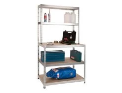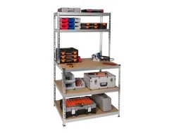 Dankzij stellingkast Heavy Duty kom je nooit meer plaats tekort in de bergruimte. Je kan dit rek snel en eenvoudig monteren (boutloos) en indien gewenst ook gebruiken als werkbank. Het rek bestaat uit verzinkte profielen en 5 legborden in vezelplaat, waarvan 2 smalle (max. 100 kg) en 3 brede (max. 175 kg). Totaal draagbare gewicht: 725 kg.