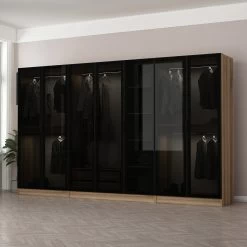 Met een royale breedte van 315 cm, een hoogte van 210 cm en een diepte van 52 cm biedt de Woody Fashion kledingkast voldoende ruimte om al je spullen op te bergen. De rookkleur voegt een vleugje verfijning en elegantie toe aan elke kamerinrichting en past naadloos in verschillende interieurstijlen.