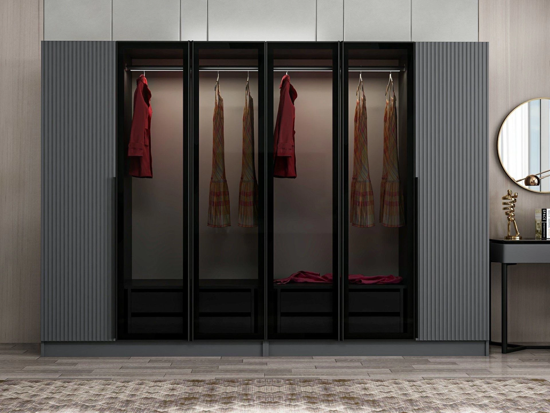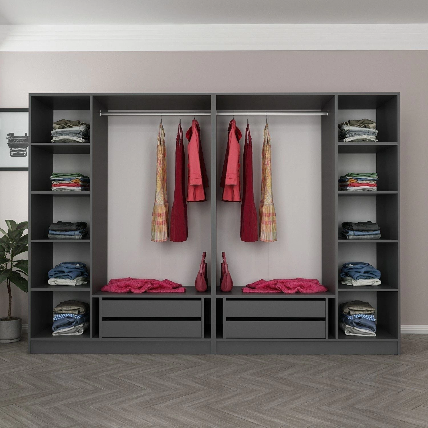 Naast de praktische functies heeft deze kledingkast ook een prachtige fumékleur. De rijke en eigentijdse tint voegt een vleugje elegantie toe aan elke kamer en verbetert de algehele esthetische aantrekkingskracht van je ruimte. Het strakke en moderne ontwerp past naadloos bij verschillende interieurstijlen, waardoor het een veelzijdige keuze is voor elk huis.