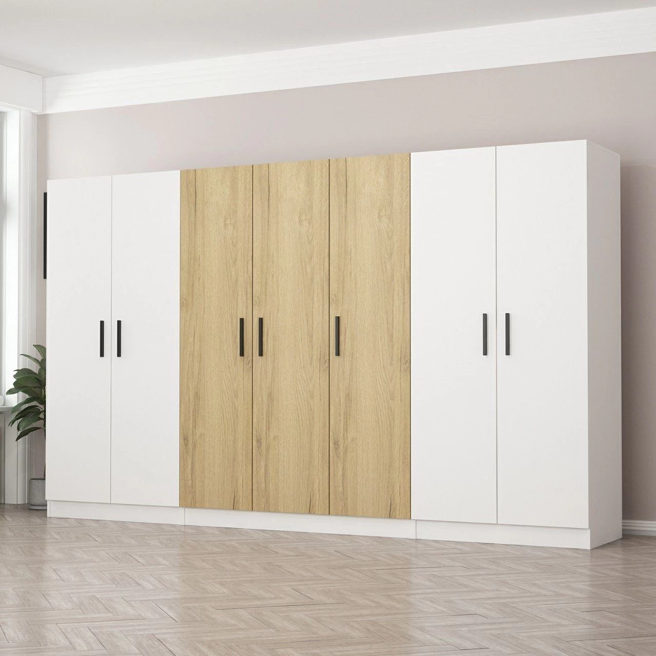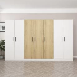 Met een dikte van 18 mm is de Woody Fashion Kledingkast stevig en betrouwbaar, zodat je kleding beschermd en georganiseerd is. De royale afmetingen van 315 cm in de breedte, 190 cm in de hoogte en 52 cm in de diepte bieden voldoende ruimte voor al je garderobebenodigdheden.