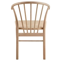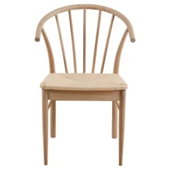Armstoel Cassandra, gemaakt uit wit gepigmenteerd eikenhout. Met een zitting uit geweven raffia.