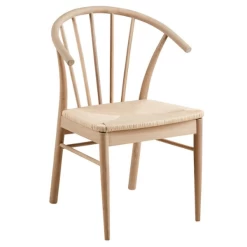 Armstoel Cassandra, gemaakt uit wit gepigmenteerd eikenhout. Met een zitting uit geweven raffia.
