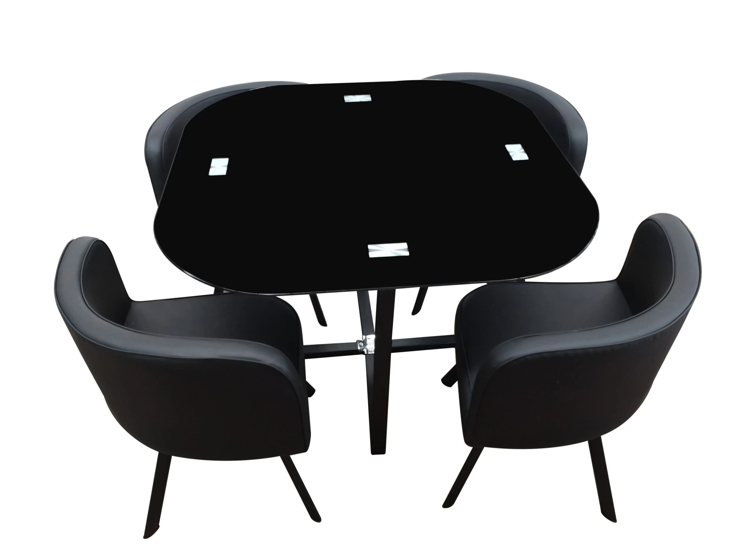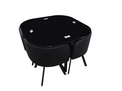Bij deze strakke tafelset Kanna kunnen 4 stoelen volledig onder de tafel worden geschoven. Het vierkante blad is gemaakt uit glas en is 8 mm dik. De stoelen zijn uit schuim en de poten uit metaal afgewerkt met poederlak.