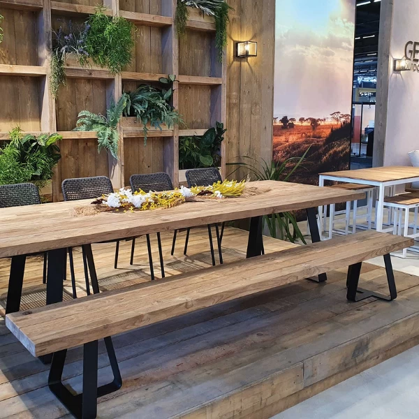 Tuinbank Margarite met een lengte van 250cm uit teakhout met ijzeren poten.