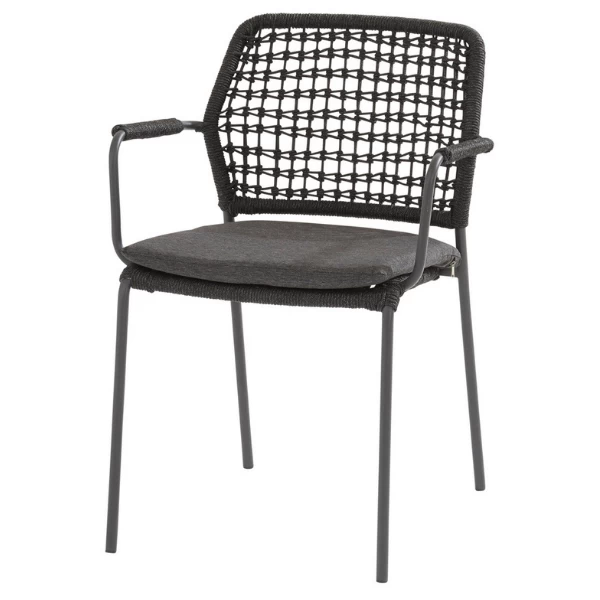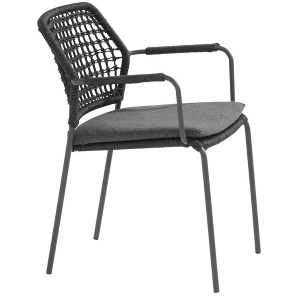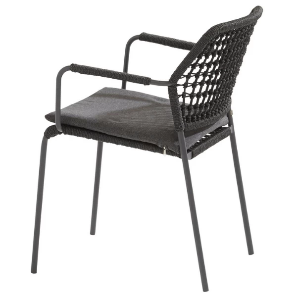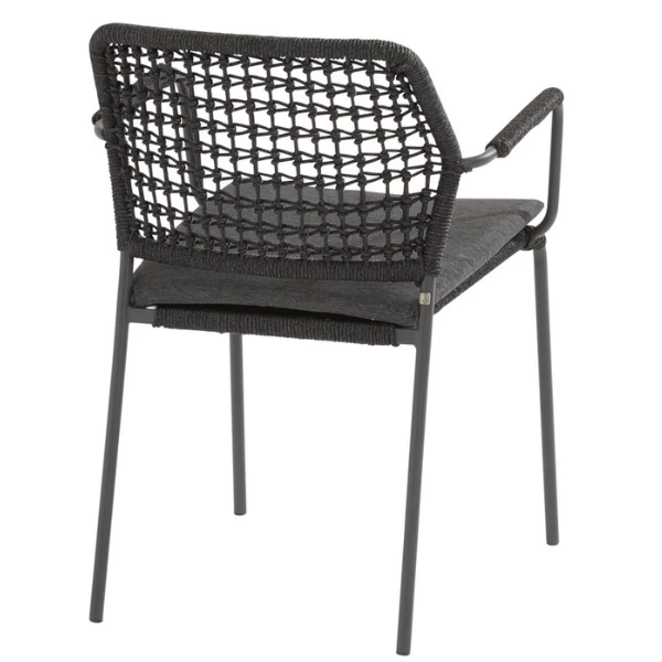 Tuinstoel Bartus, gemaakt uit een frame van RVS met een rugleuning uit antracietkleurige touw. Inclusief zitkussen van Olefin. De stoelen worden per 6 verkocht.Ā