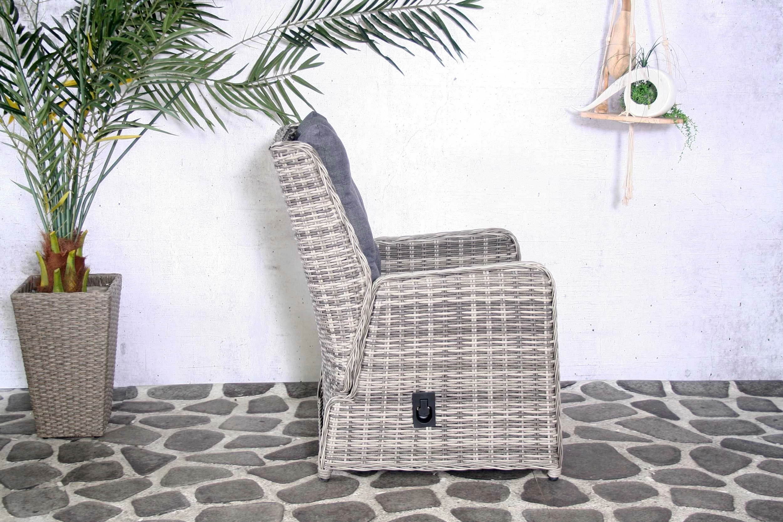 Tuinstoel Clark, gemaakt uit een aluminium frame en grijze wickerbekleding. Donkergrijze, waterresistente kussens in polyester inbegrepen.